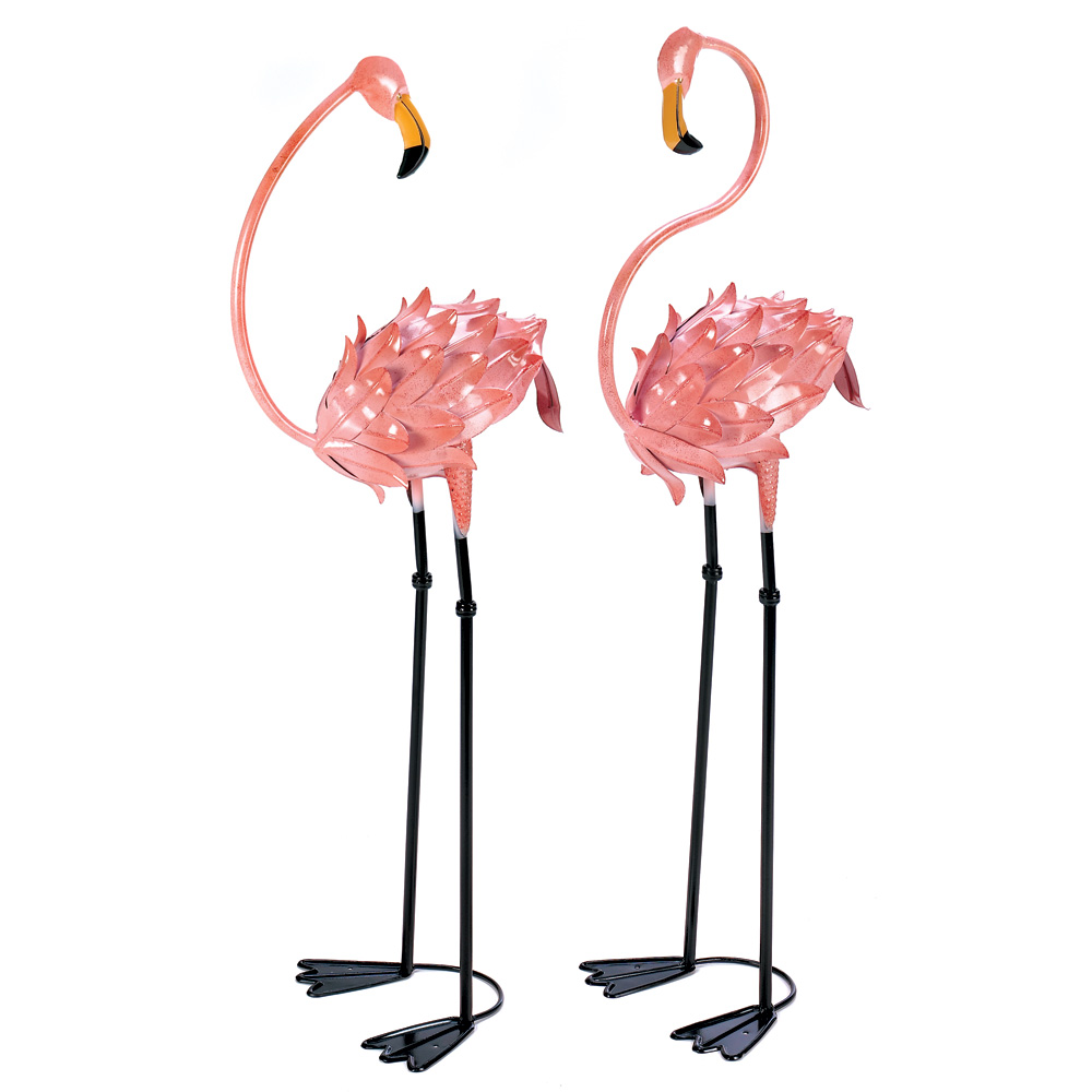• Brighten your favorite space with a luscious touch of the tropics. These life-sized metal flamingo sculptures make a colorful splash that's a pure delight.
