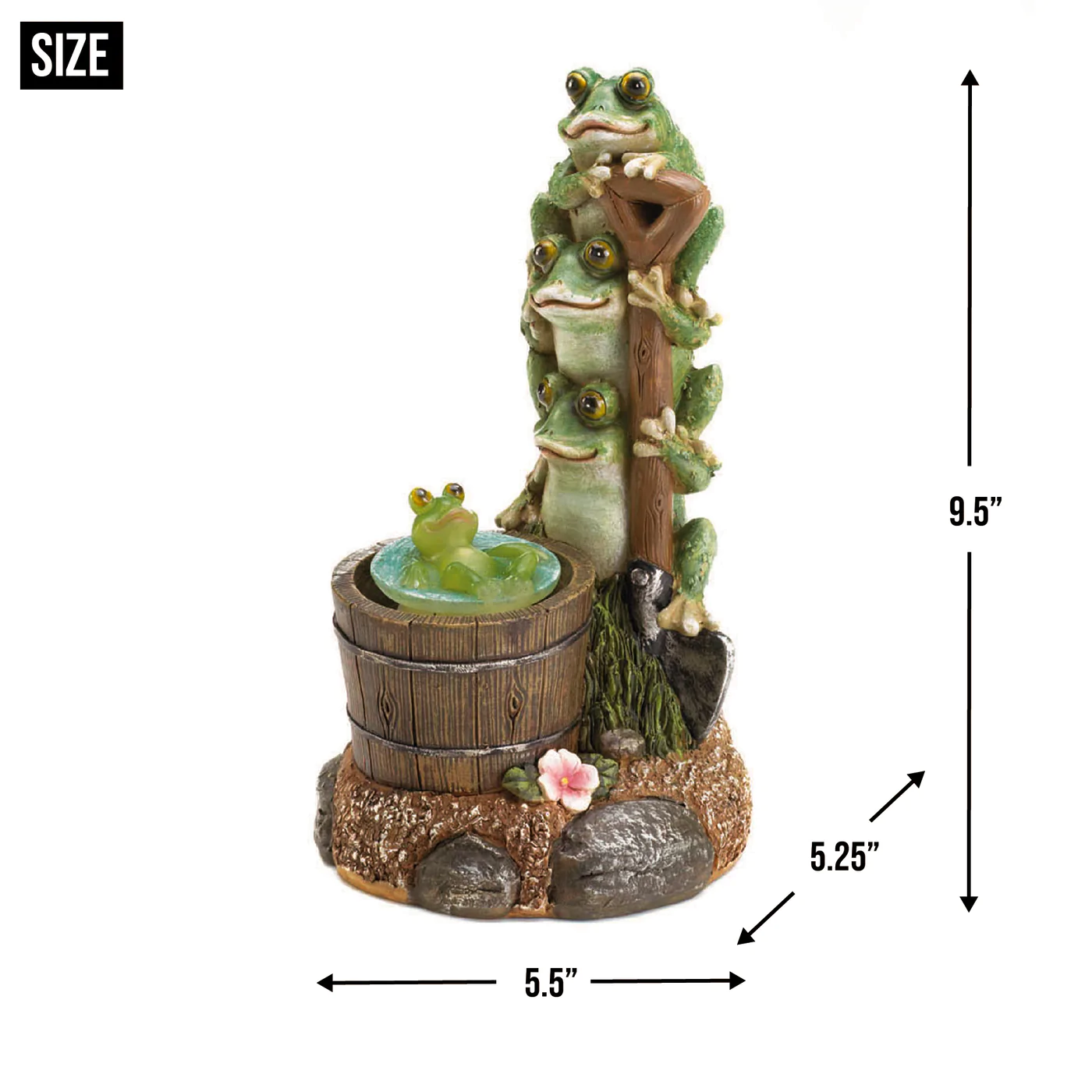 • This statue features three smiling frogs standing tall on a garden shovel, while a little frog takes a dip in a rain barrel. The little frog rotates and lights up at night with help from the sun's power by day.