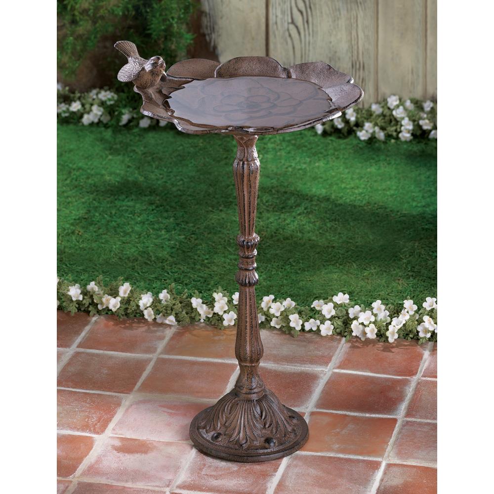 Attract flocks of visitors to your garden with a sparkling oasis! A sweet addition to a shady corner or sunny knoll, this enchanting garden decoration serves as a welcome watering stop for thirsty birds! Weight 8 lbs. 12" x 10" x 18Â¥". Cast iron. UPC: 849179004217.