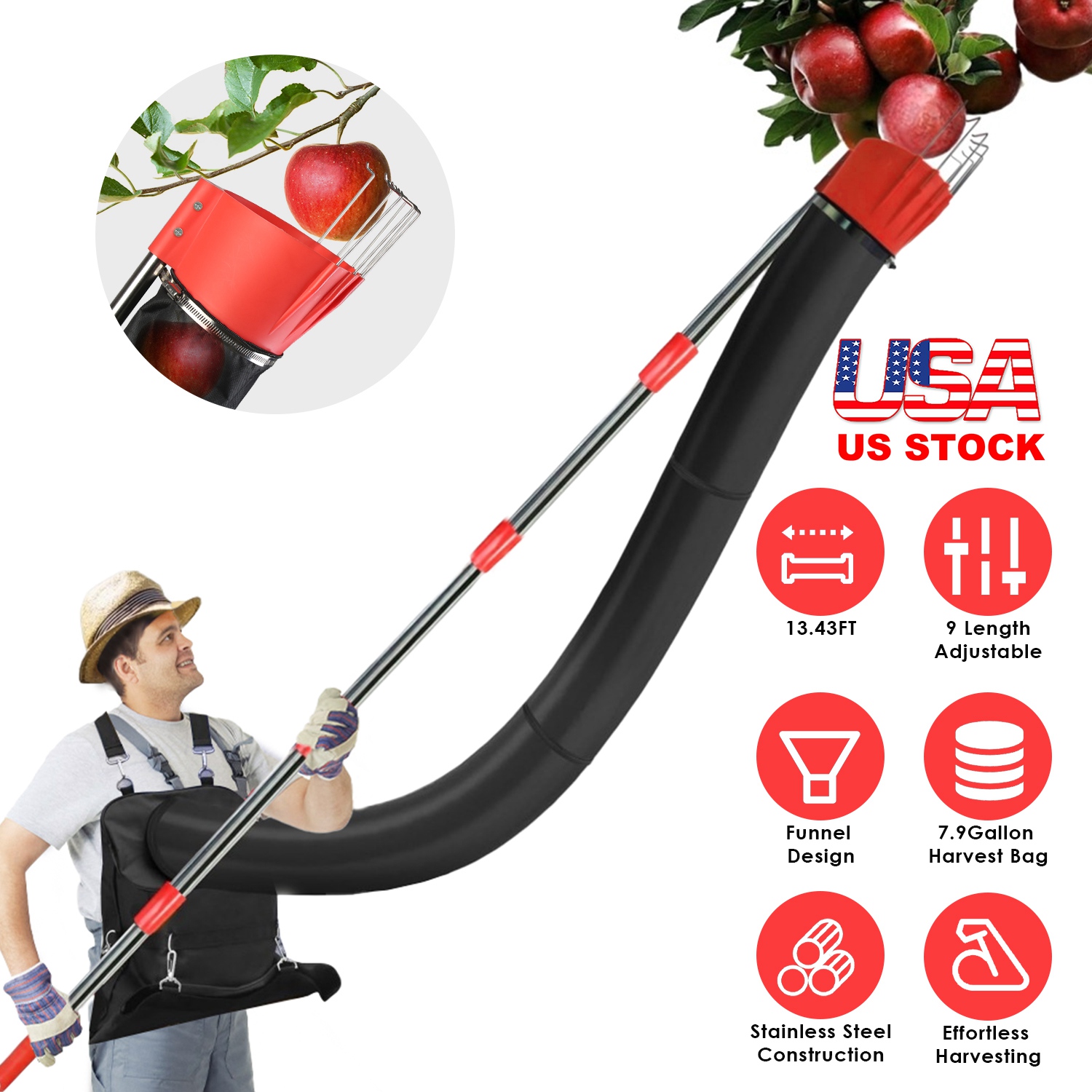 This fruit picker pole with harvest bag has a full length of up to 13.43ft, allowing you to effortlessly pick fruits from tall trees without using a ladder, transforming your fruit-picking experience. Feature 9 adjustable lengths from 2.62ft to 13.12ft, reaching fruits at different heights easily. The 7.9 gallon harvest bag and 6.57in basket diameter make it able to handle a variety of fruits with a diameter of less than 5.31inches. Constructed with solid stainless steel poles and oxford fabric collection bag, long-lasting for many seasons to come. We also provide 2 adjustable shoulder straps, making it easy and comfortable for you to carry the bag while picking fruits. If you're a home gardener or a professional grower, this tool is a must-have for your harvesting needs!