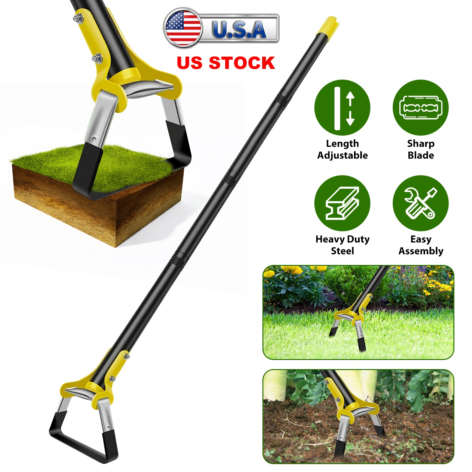 The garden hoe adopted with special hollow design, push-pull motion and sharp blade, is a perfect solution for weeding and cultivation. Save half the time of weeder by hand. Length adjustable design allows you to adjust it to different length to meet your personal needs, offering you max comfort. Advanced 65 Manganese Steel+201 Stainless Steel with Electrophoresis surface process ensures durability and long lifespan. Easy to hang it with the hole design on the handle for storage when not in use. A very practical hand tool for gardeners.