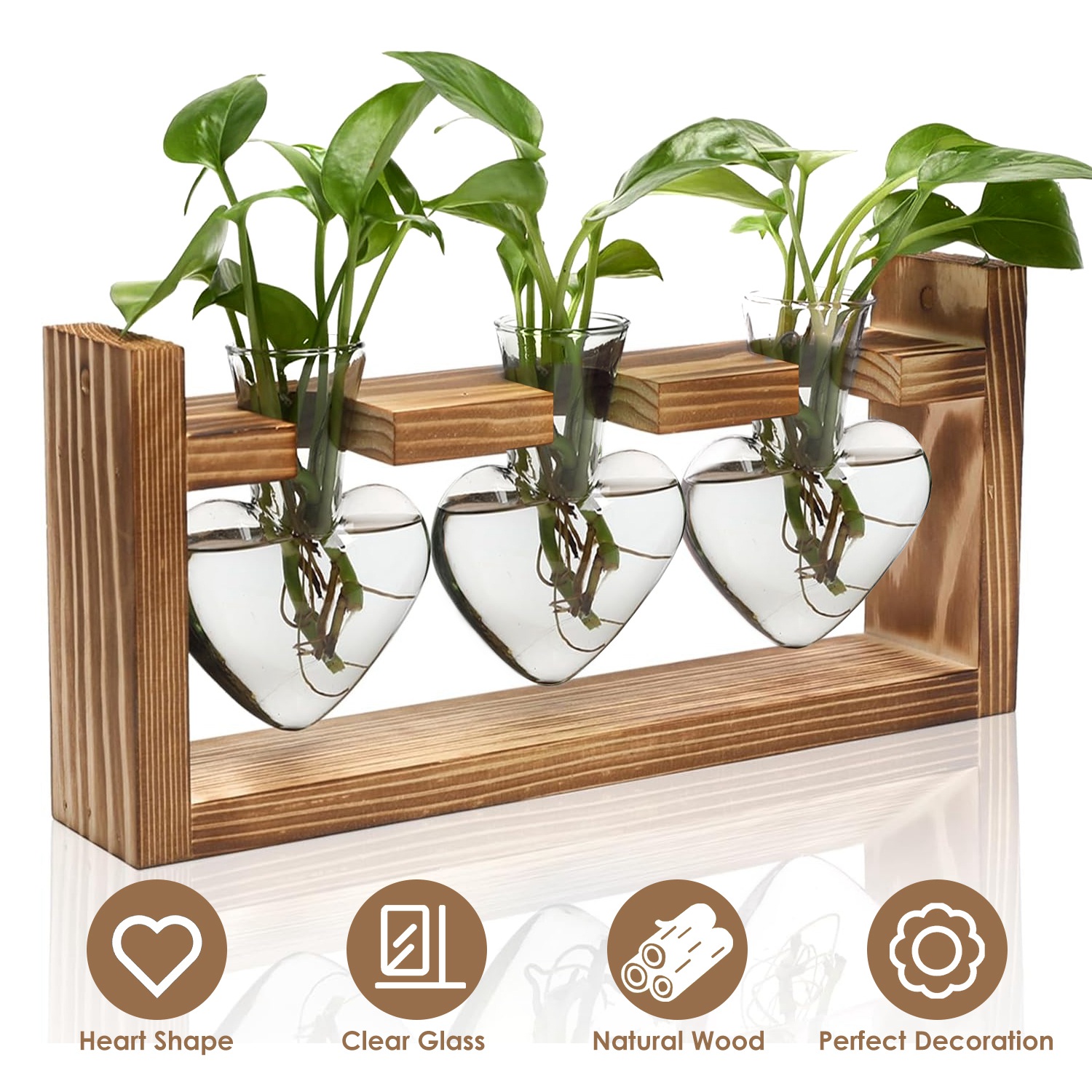 Perfect addition on windowsills, office desks, living room tables, bedrooms, kitchens, cafe shops, and more. Our plant propagation station with unique heart-shaped design transforms any mundane space into a serene environment filled with life, while enjoying the pleasure of nurturing your favorite plants. Clear, transparent, and heat-resistant glass ensures longevity, while natural wooden stand is solidly constructed and resistant to fading over time. An ideal gift for the plant lovers in your life in Valentine’s Day, Mother’s Day, Father’s Day, Thanksgiving, Christmas, birthdays, or anniversaries.