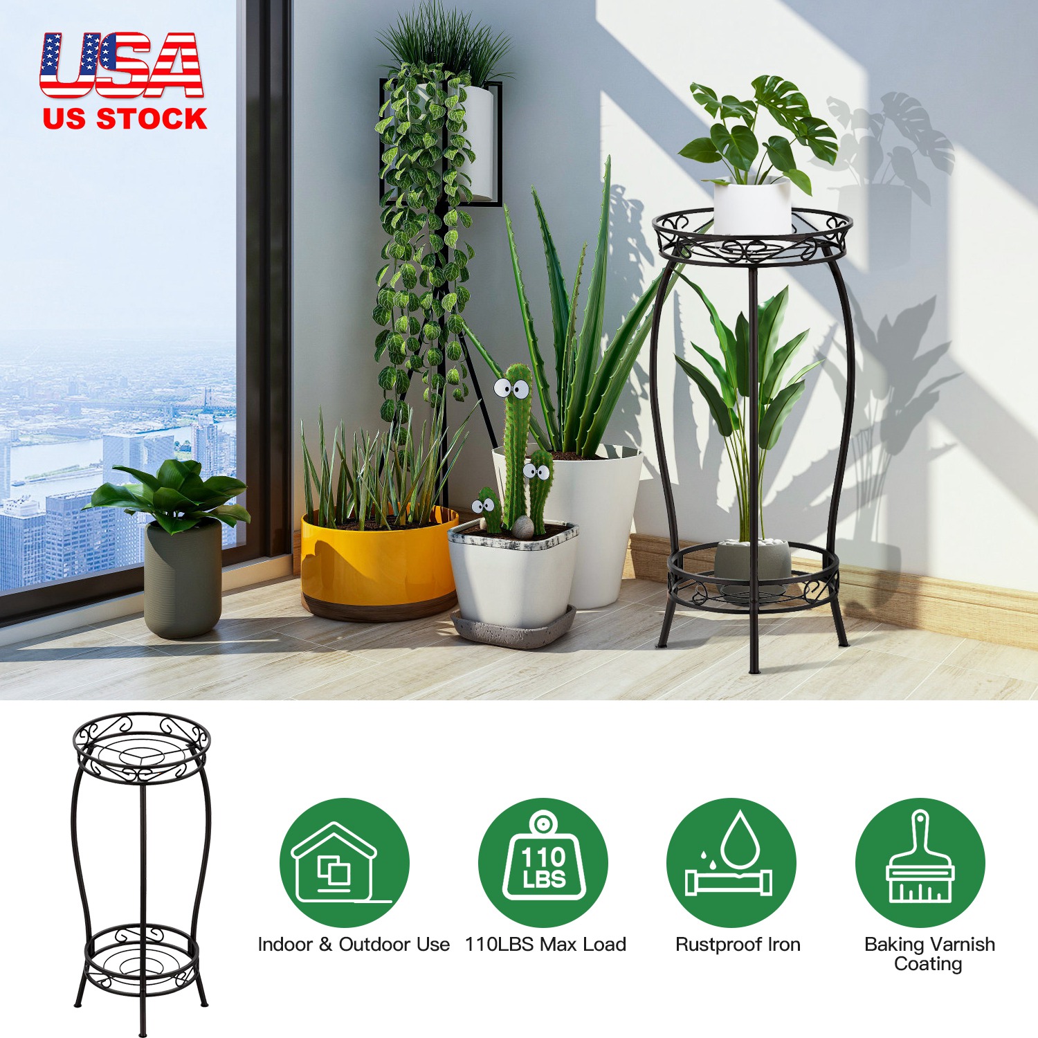 Our 2-tier plant stand with simple modern appearance can perfectly match various decoration styles both for indoor and outdoor. Made of high strength iron with rustproof baking varnish coating, the stable triangular 3-legs construction can bear up to 110lbs capacity and withstand humid environment. Curved legs with anti-slip pads achieve larger contact area on the floor to effectively avoid any scrapes or dents during moving. Not only suitable for displaying plants in corners, but also suitable for storage items in bathroom, living room, bedroom, etc..