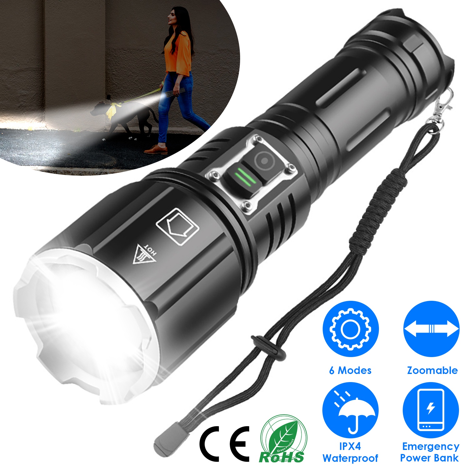 100000LM Super Bright LED Flashlight Waterproof Rechargeable Zoomable Tactical Torch Light Emergency Power Bank Support 3 Battery Types