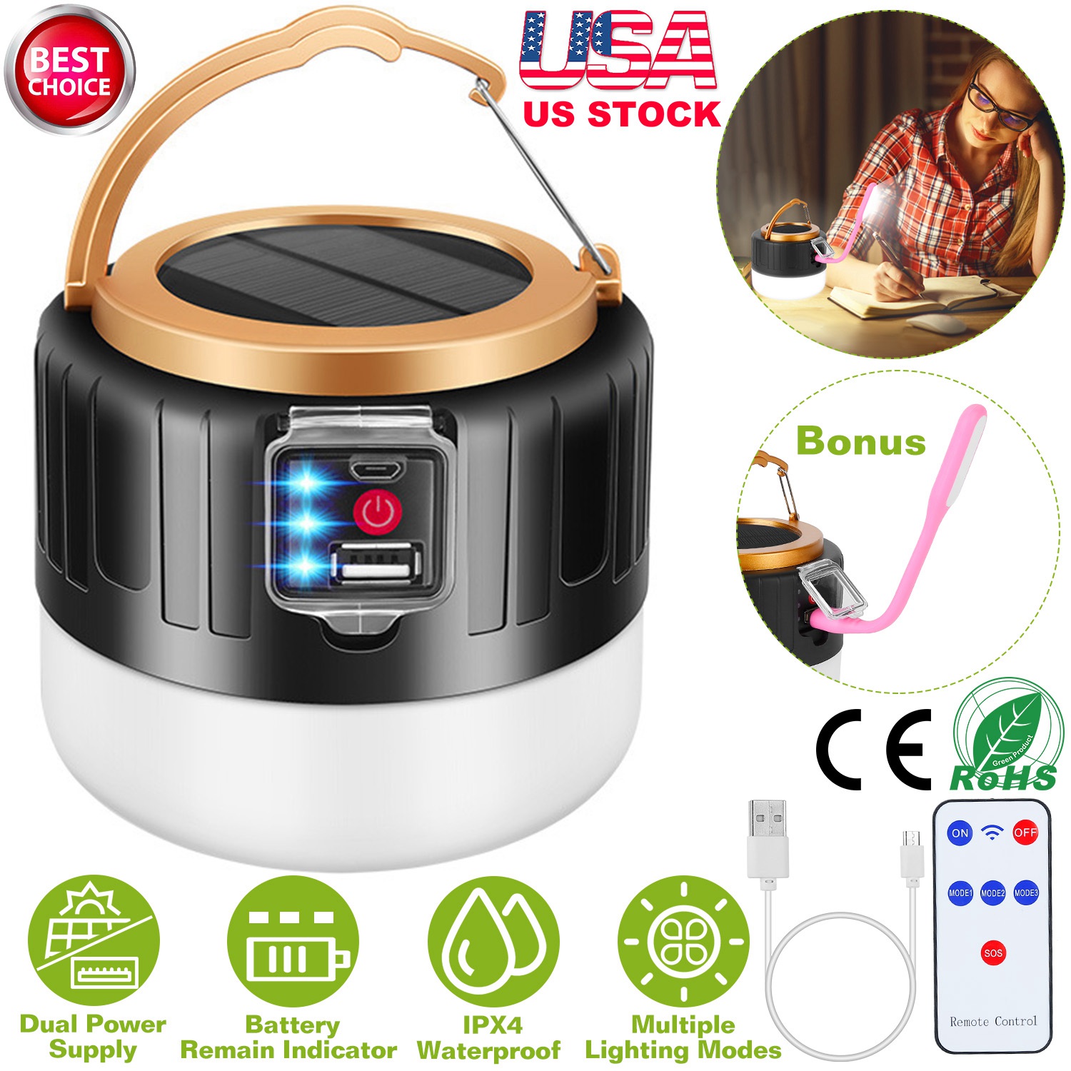 Brighten up your night anywhere with our rechargeable camping lights and plug & play reading light, it is not only for outdoor use, but also great for indoor use. Our camping lantern is perfect for backpacking, hiking, camping, fishing, nightlight, reading, emergency light for hurricane, power outage and so on. Built-in overall 5400mAh rechargeable battery, our camping lanterns is not only a lantern, but also worked as a power bank, charge your devices in emergency. Powered by solar energy and powered through USB cable, no worry about our lantern light runs out of battery. Featured with IPX4 Waterproof and hanging hook, our camping light is freely use in outdoor harsh environment and hang on branch or tent hook.