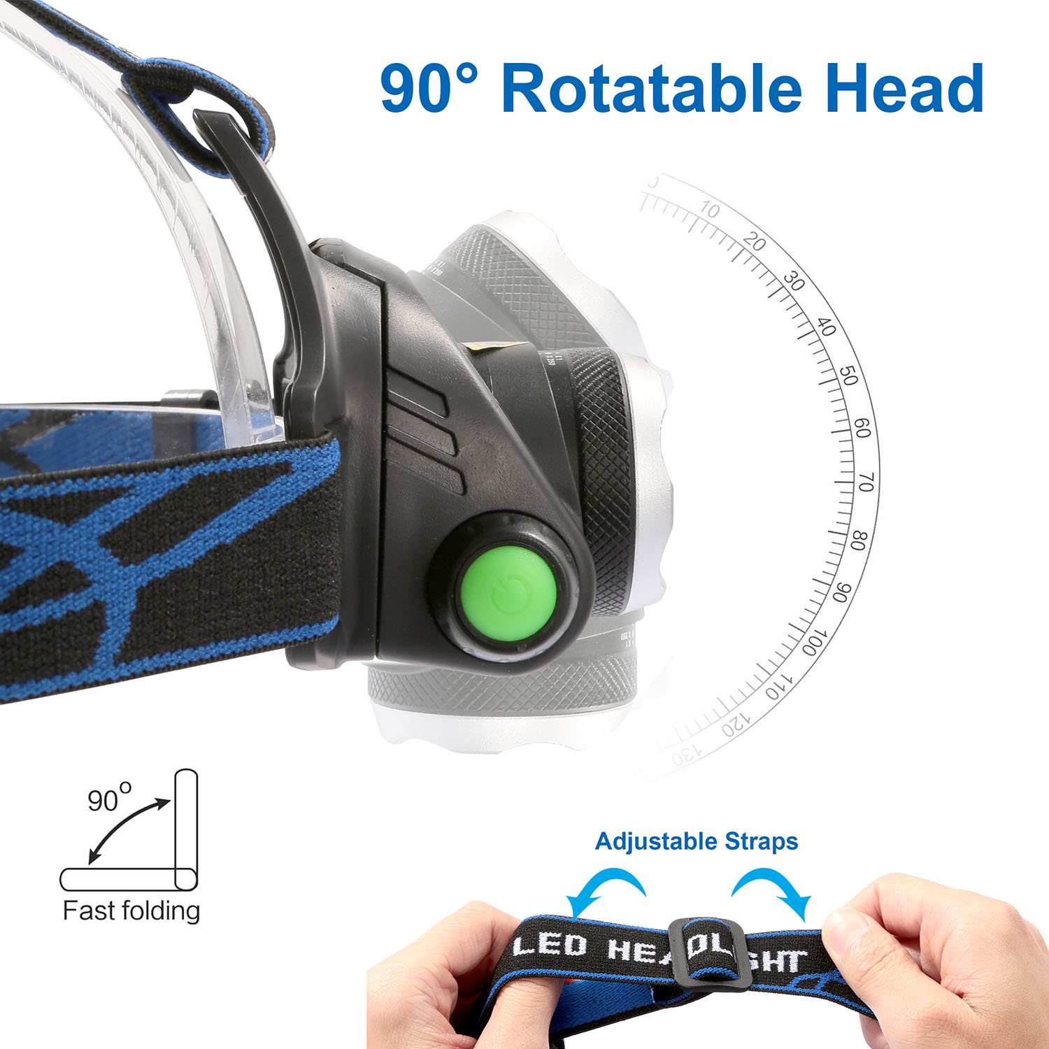 Our LED Headlight adopts aluminum alloy and ABS materials, lightweight but durable. Featured with high-grade advanced LED beads and up to 1640ft long projection range, and, it supports 3 light modes (Super Bright Mode-Low Bright Mode-Sharp Flash Mode) and easily switch via its pressing button, plus its 90° adjustable lighting angles. Its sharp flash SOS mode can send emergent SOS signal to protect you in some emergency occasions. Moreover, IPX5 waterproof performance is optimal for free outdoor use even in rainy, snowy or other weather conditions. Widely used in camping, hunting, running, riding, night fishing, searching or other outdoor activities.