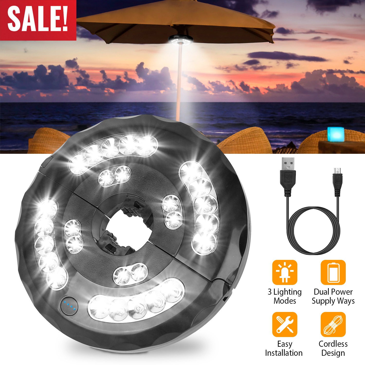 Do you want to enjoy a happy night chat with your friends or family in courtyard? Our umbrella pole light gives you a strong assistance! Built-in 28 powerful LEDs, 3 lighting modes, our umbrella pole light is bright enough and suitable for your different needs. Powered by built-in 2000mAh rechargeable battery or 4pcs AA batteries (Not Included), easy using when in emergency situation. It is cordless design and easy for mounting and carrying when travelling outside.