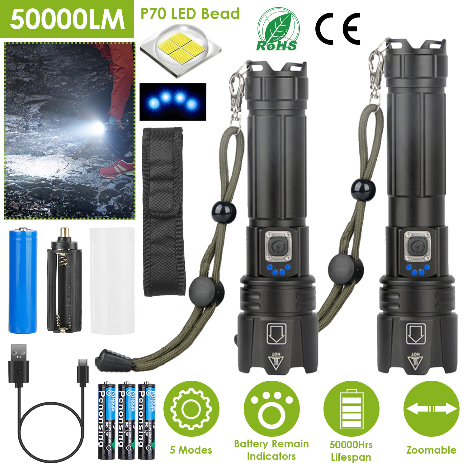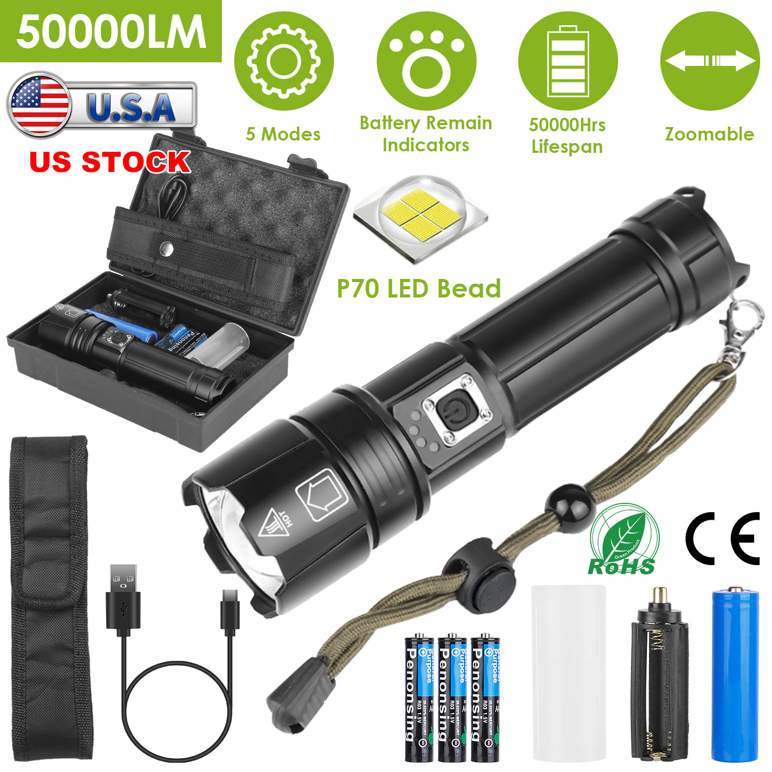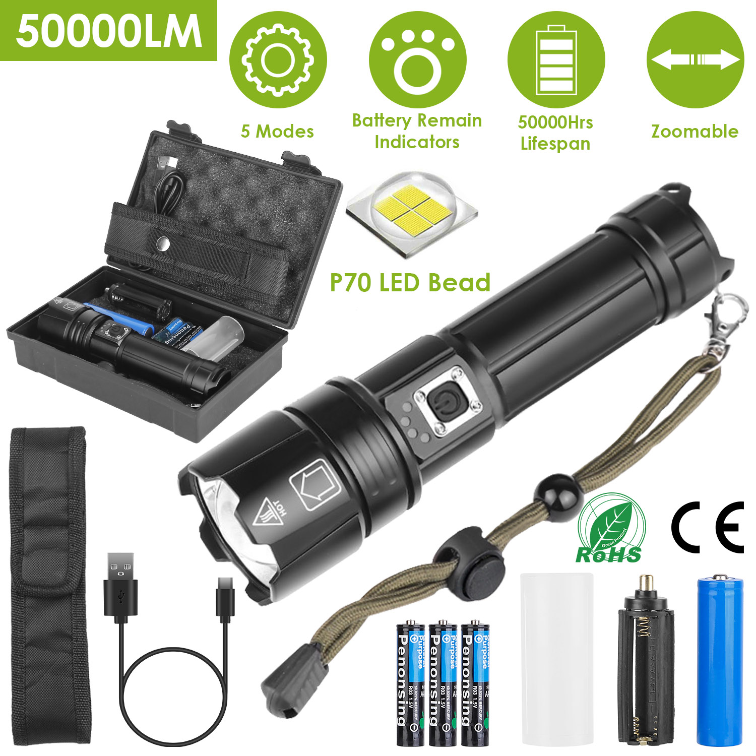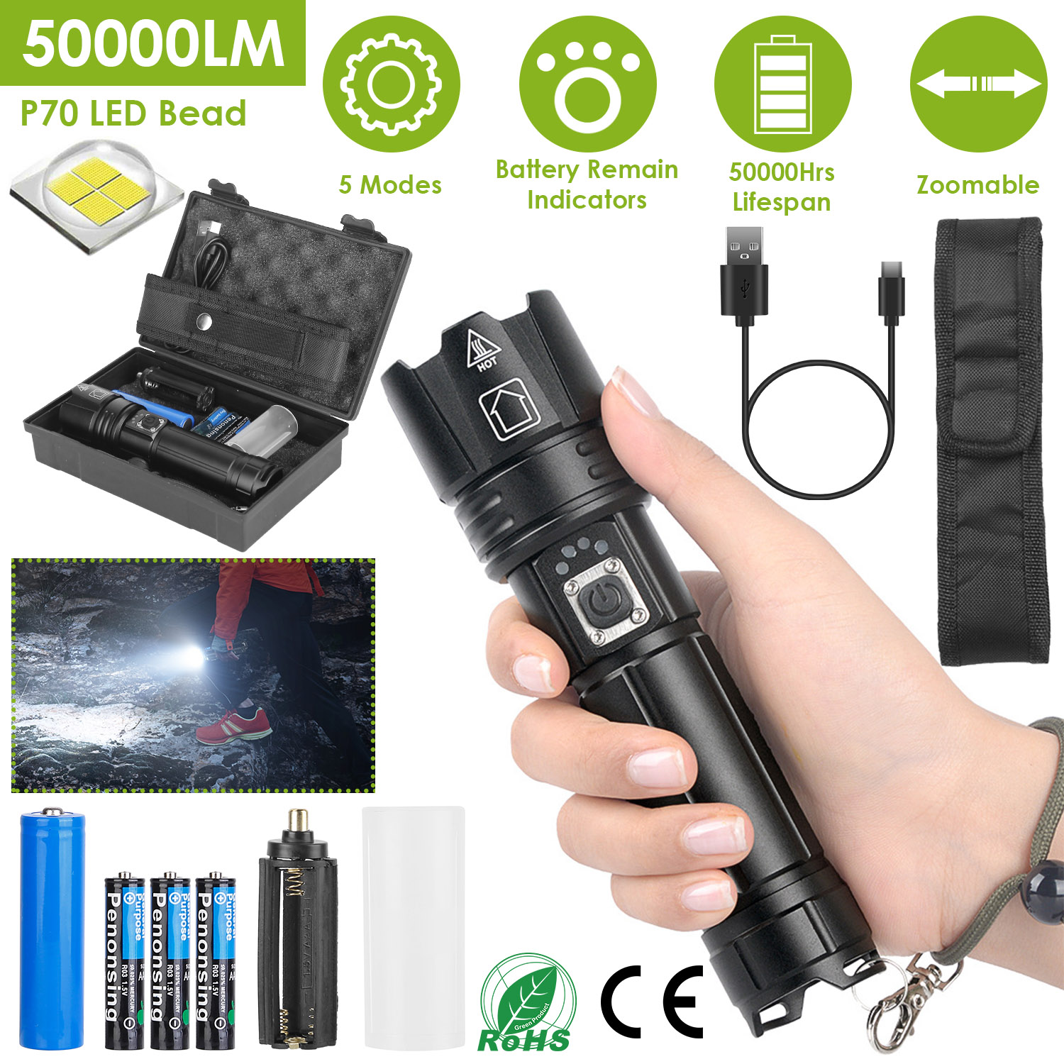 Our flashlights, featured with 50000lm super bright, 50000Hrs maximum lifespan, 5 working modes (High/Medium/Low/Turbo/Slow strobe) meet your different lighting demands. Focus adjustment supports 1640ft lighting range, spot beam or flood beams. Bright zoomable focus is optimal for distant observation and wide range illumination. IPX4 Waterproof performance and aluminum alloy material is freely used in little rainy, snowy or other weather conditions. Come with a detachable lanyard, belt pouch and anti-slip handle, put into your pocket or handheld firmly. Widely used in camping, adventures, searching or night walking, etc..