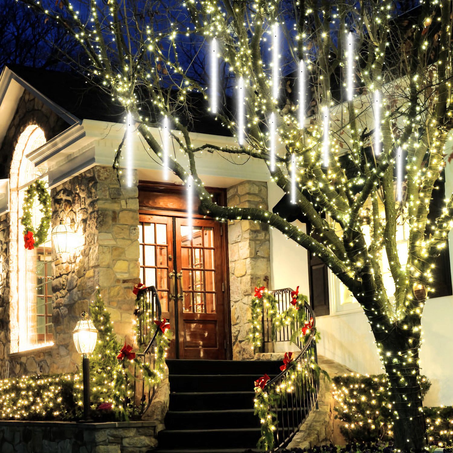 Our meteor shower rain light adopts high-bright and low power consumption 3528 LED chips which can turn on and up one by one in sequence just like meteor shower streaking across the night sky, bringing a visual feast and creating romantic atmosphere for you. And it can still work in rainy and snow days with IP44 waterproof performance and is a perfect decoration on Christmas, Wedding, Birthday Party, Valentine's Day, and decoration of trees along streets, parks, river, attractions landscaping, shopping malls, hotels, etc.