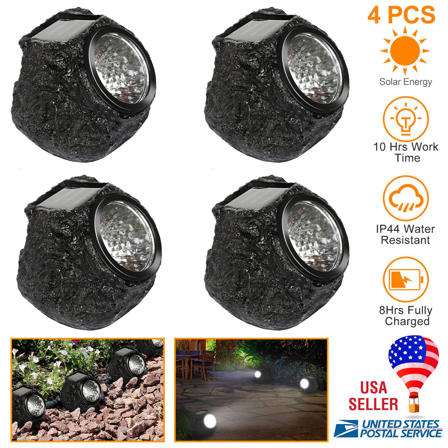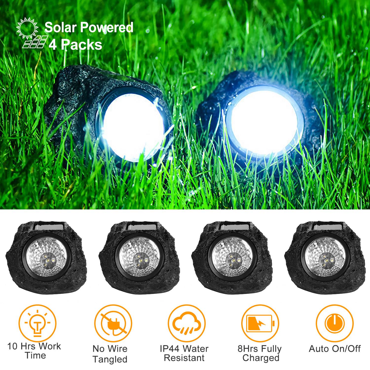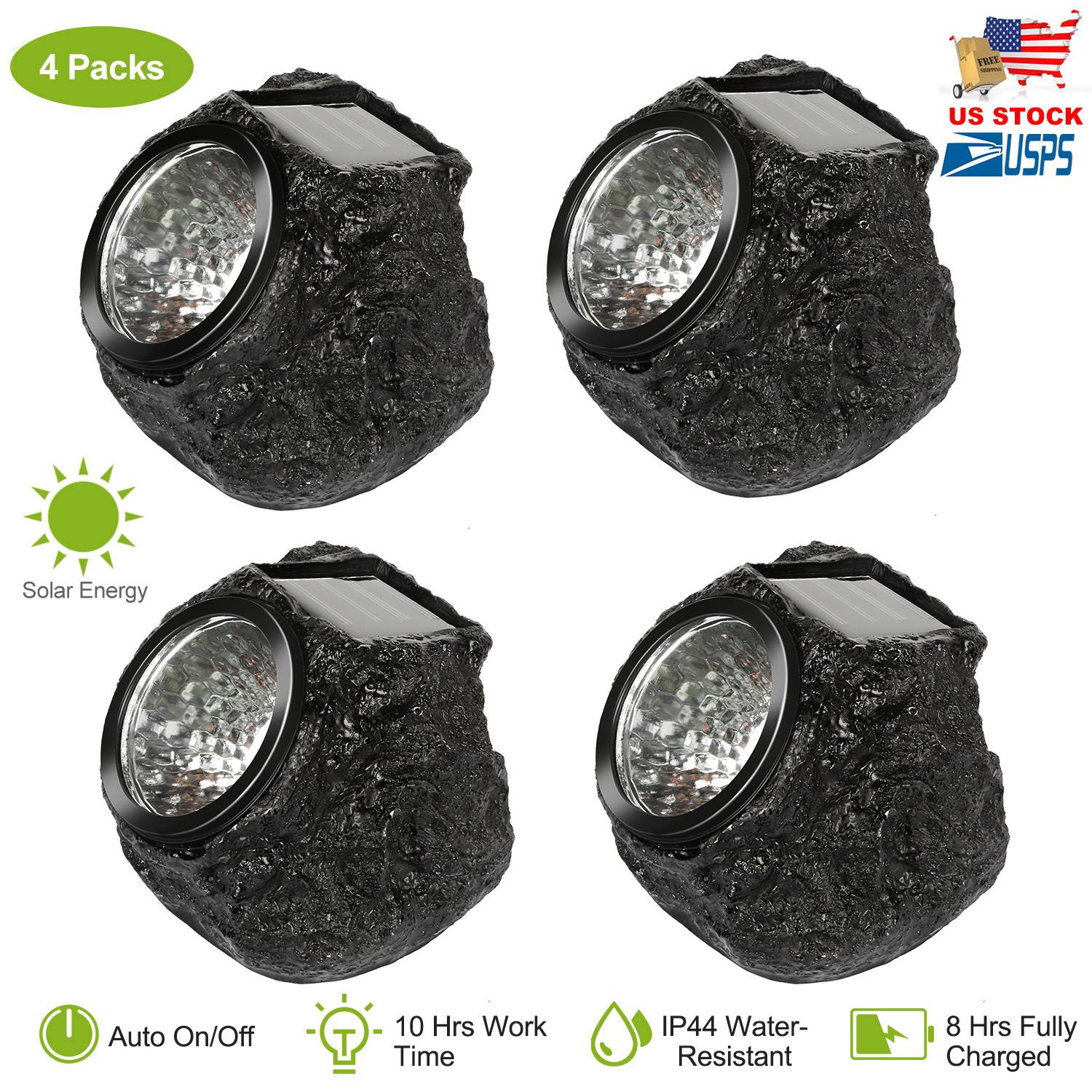 Our Outdoor Solar Rock Light, inbuilt with an upgraded photocell sensor, will auto turns off in the daytime and turn on during the night. (Turn on manually for the first time use.) 4 Packs Solar rock-shaped lights provide a natural outlook that beautifully blends into your landscape with a wide illumination angle. 8 Hrs fully charged in the direct sunlight and 10Hrs illuminate during the night, no wire hassle and energy-saving. IP44 water-resistant performance can resist rainy, snowy or other weather conditions. Widely used in your garden, pathway, driveway and walkway, etc..