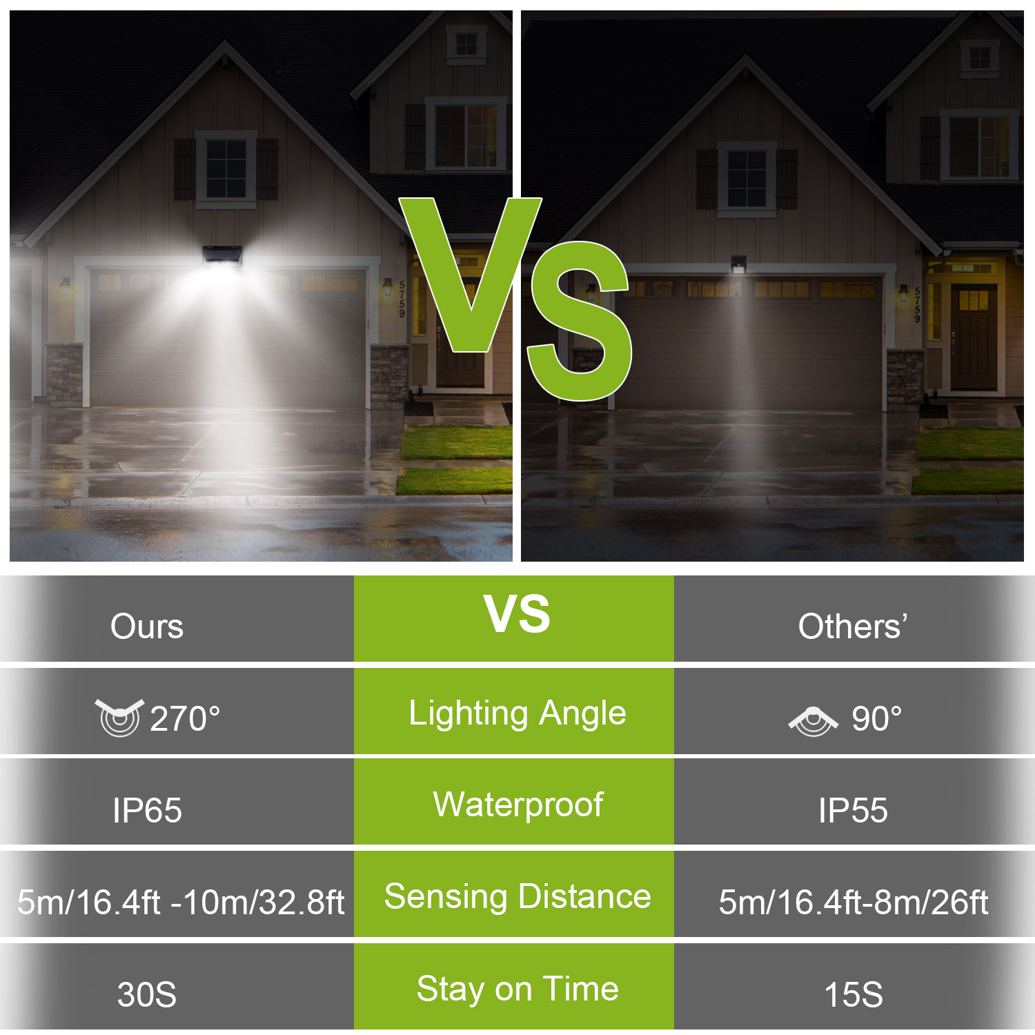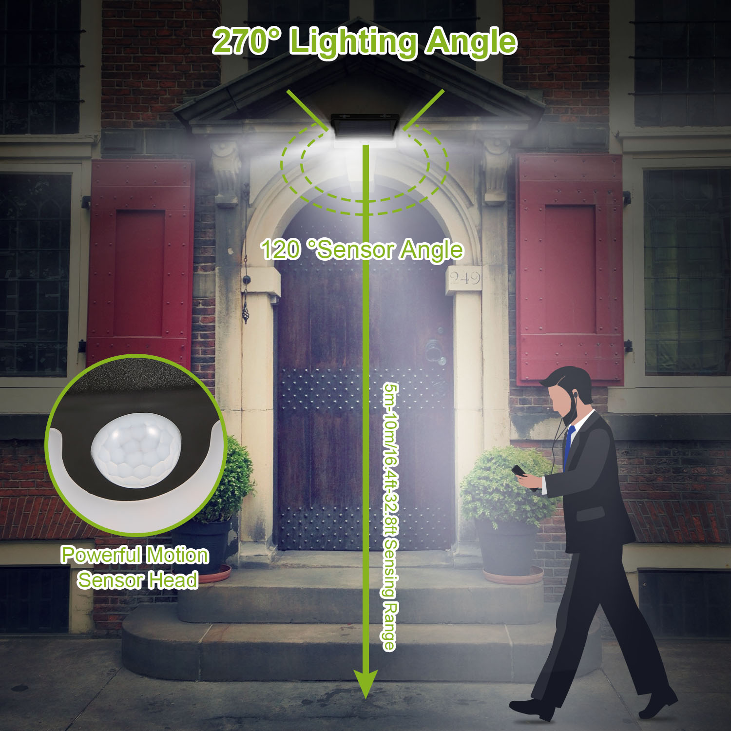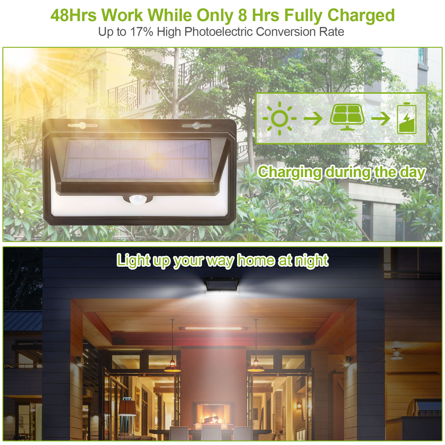 Our Outdoor Solar Flame Wall Light offers an optimal solution for illuminating 270° at dark night, which features upgraded 120° PIR motion sensor, inbuilt bright 158 LEDs, dual 2000mAh rechargeable batteries, IP65 Waterproof and heatproof. It can be easily installed without fear of environmental damage and fully charged about 8 Hrs under the direct sunlight. During the day the solar light will automatically switch off to save energy; and it will turn on with 3 optional lighting modes when motion is detected (the third mode is on flame at all night) within 10m in darkness or at night, so you can find your way. Use our LED sensor wall light for your garden, backyard, deck, porch, patio, pond, garage, driveway, pathway or any outdoor location that needs a light.