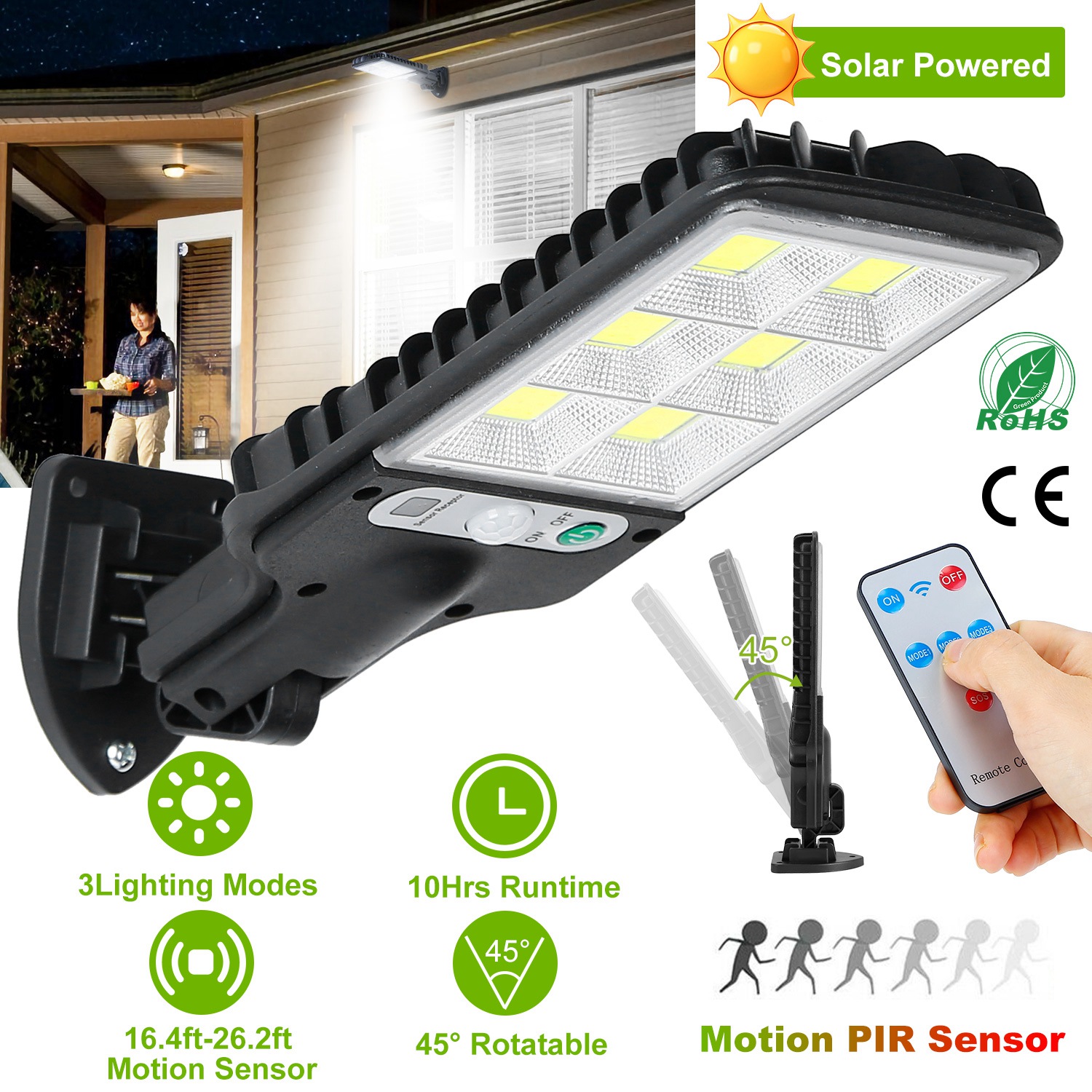 Our Solarek Solar Light offers an optimal solution for illuminating at dark night; which features upgraded PIR motion sensor; remote controller; inbuilt bright upgraded LEDs; 180degree illumination angle; 1Pc 1200mAh rechargeable battery. It can be easily installed without fear of environmental damage and fully charged about 8hours under the sunlight. During the day the solar light will automatically switch off to save energy; and it will turn on when motion is detected within 26.2ft in darkness or at night; so you can find your way home. Use our LED Sensor light for your garden; backyard; porch; patio or any outdoor location that needs a light.