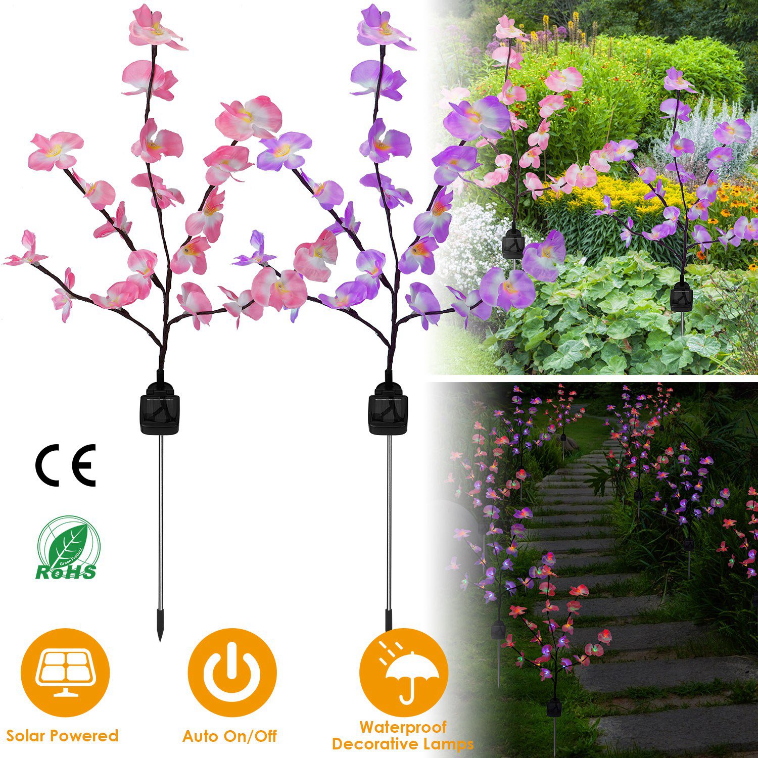 Are you looking for some elegant solar light for outdoor decoration? This is a wise choice for your outdoor decor! Lifelike orchid of two colors features a built-in solar panel that absorbs sunlight by day. It will automatically turns on at dusk, creating a warming and funny atmosphere for you. It is great to decorate your garden, lawn, pathway, patio, walkway, fence, backyard etc..