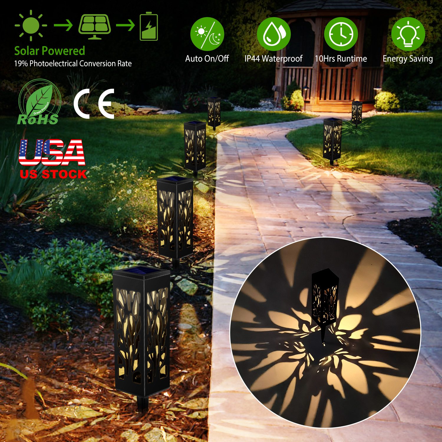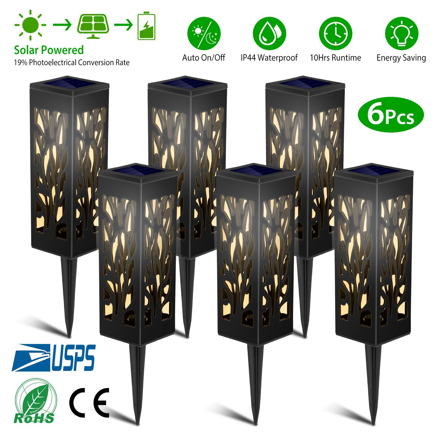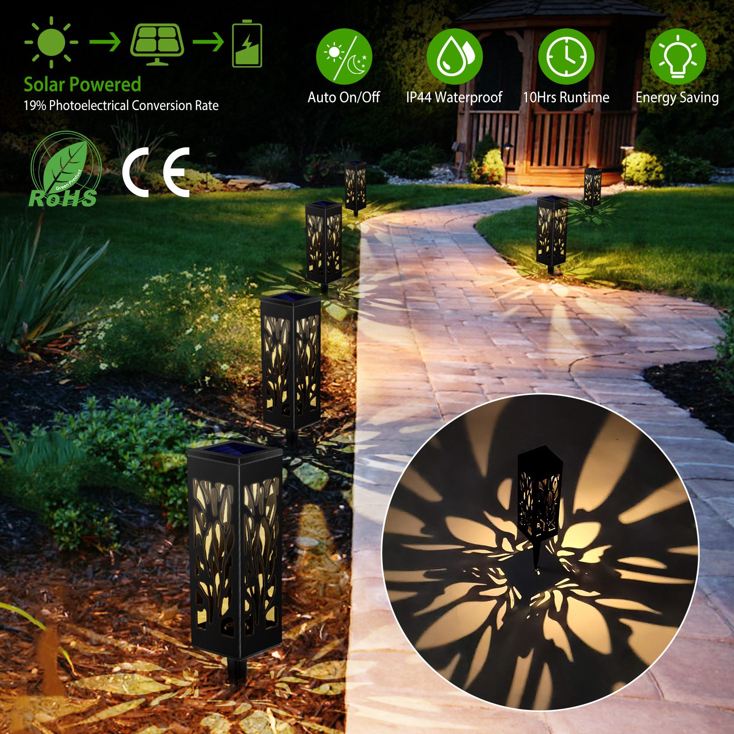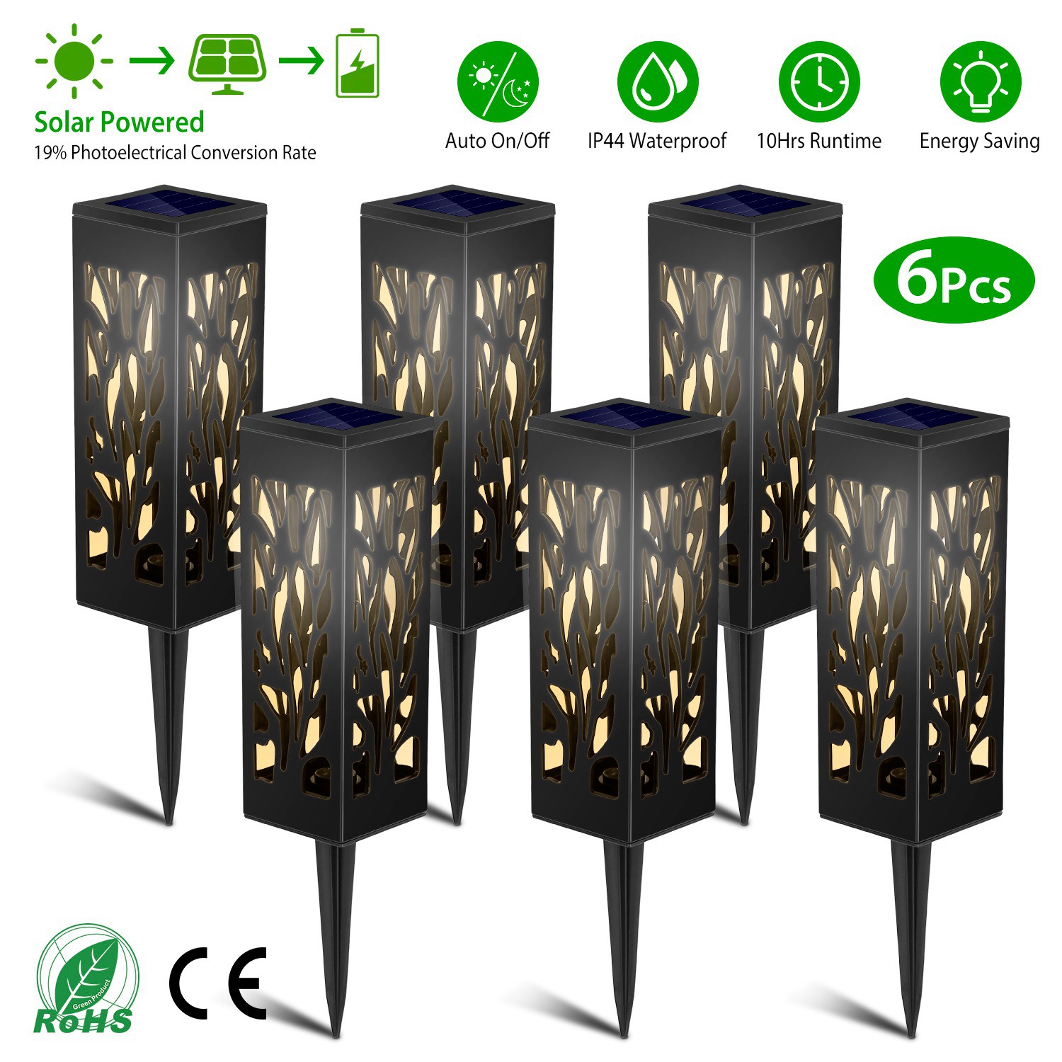 Path lights are a quick and easy way to decorate your home, and the Solarek Solar Lights are the perfect solution! 6Pcs incredible solar lights are designed with a gorgeous branch pattern and emit soft, balmy light. The high-efficiency solar panels harness power of the sun to provide up to 10 hours of balmy light. The top-of-the-line sensor quickly detects changes in light, turning the light on automatically at dusk and off at dawn. IP44 waterproof design and easy installation, render our solar lamps are a great decoration for your yard, garden, pathway, etc..