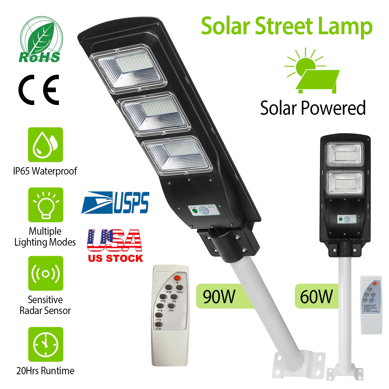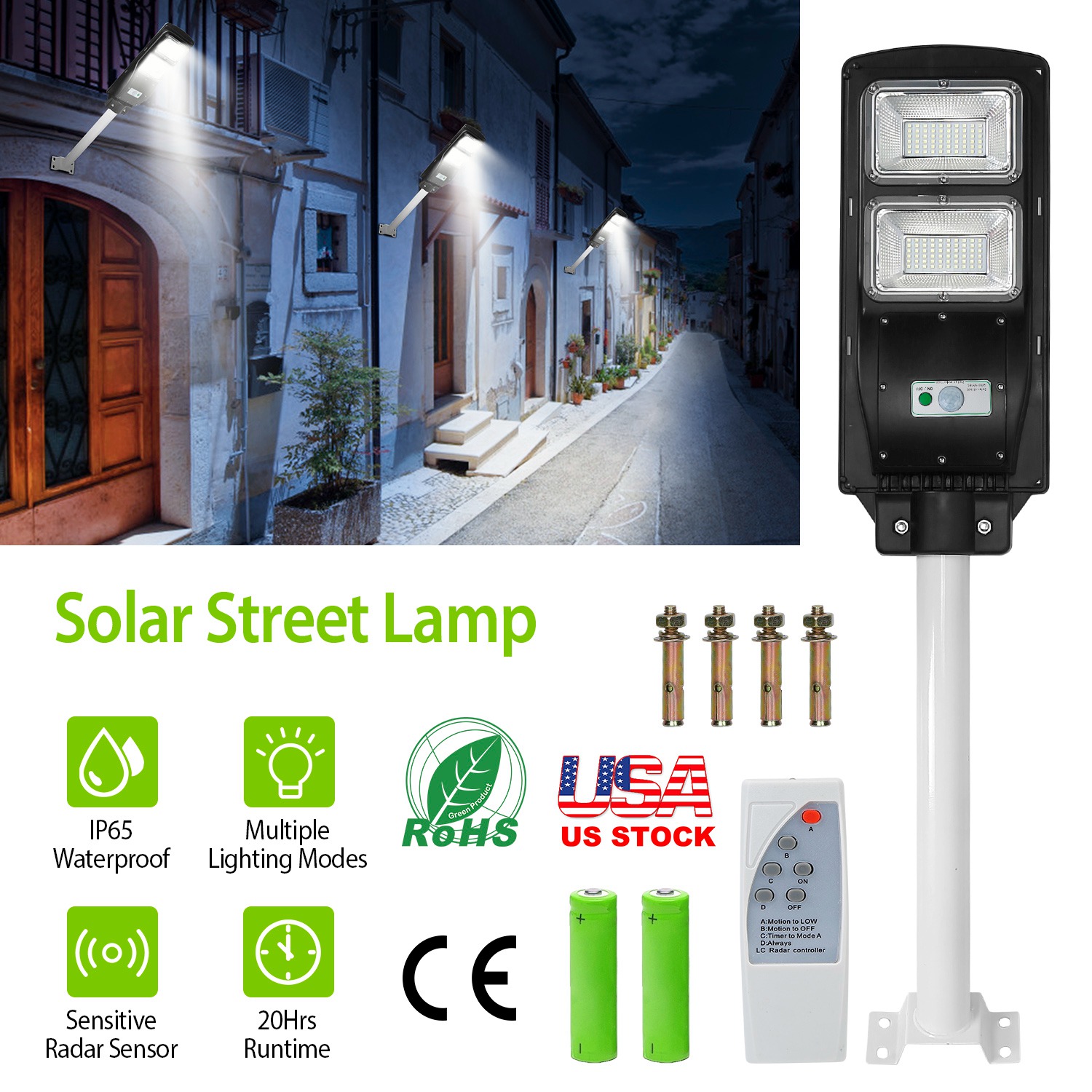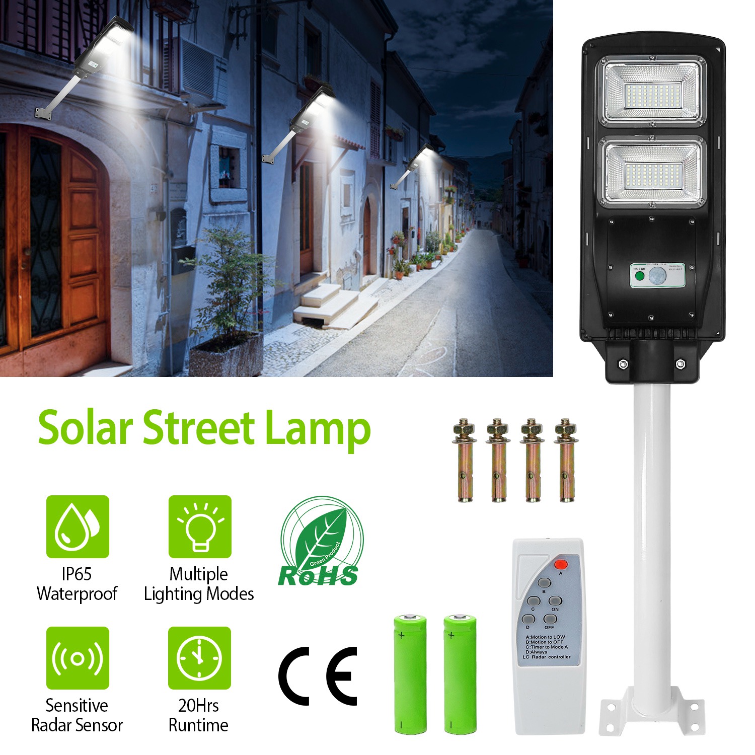 Our Solarek Solar Light offers an optimal solution for illuminating at dark night; which features sensitive radar sensor; remote controller; inbuilt bright 120LEDs; 120degree illumination angle; rechargeable battery; IP65 Waterproof and heatproof. It can be easily installed without fearing of environmental damage and fully charged about 6hours under the sunlight. During the day the solar light will automatically switch off to save energy; and it will turn on up to 20Hrs at night; so you can find your way home. Use our solar street light for your garden; backyard; deck; porch; patio; pond; driveway; or any outdoor location that needs a light.