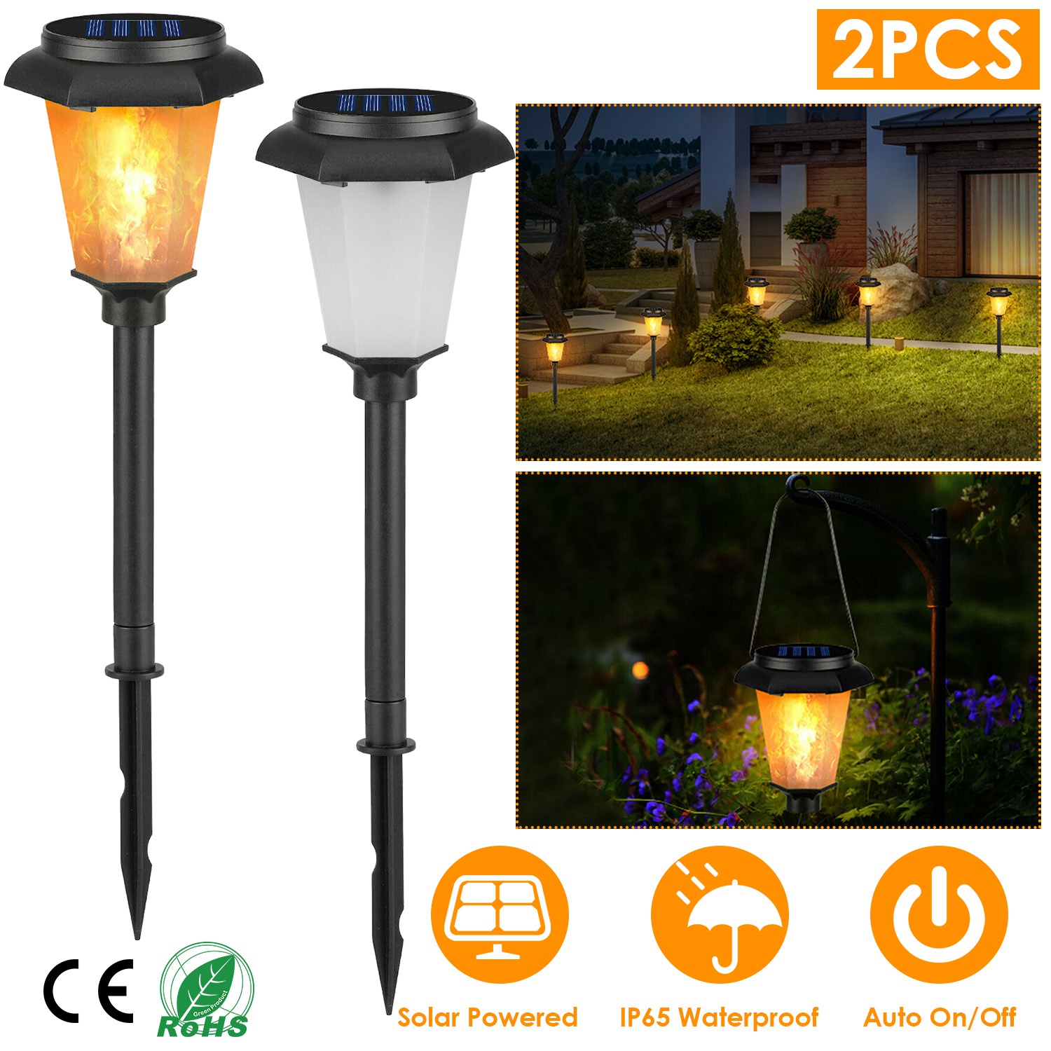 Our flame solar lights, built-in 12Pcs LED beads per light cast realistic flickering flame light effect, add romantic atmosphere to your BBQ, camping or wedding, a landscape light decorate your garden, lawn, etc.. Built-in sensitive light sensor, auto turns off during the day and turns on at night. Its solar panel with 19% high photoelectric conversion can effectively absorb the sunlight on the day and convert sunlight into electricity to fully charge the inbuilt battery about 8Hrs. Light your garden for 10Hrs. IP65 Waterproof and dust-proof performance, can withstand bad weather and free use in outdoors.