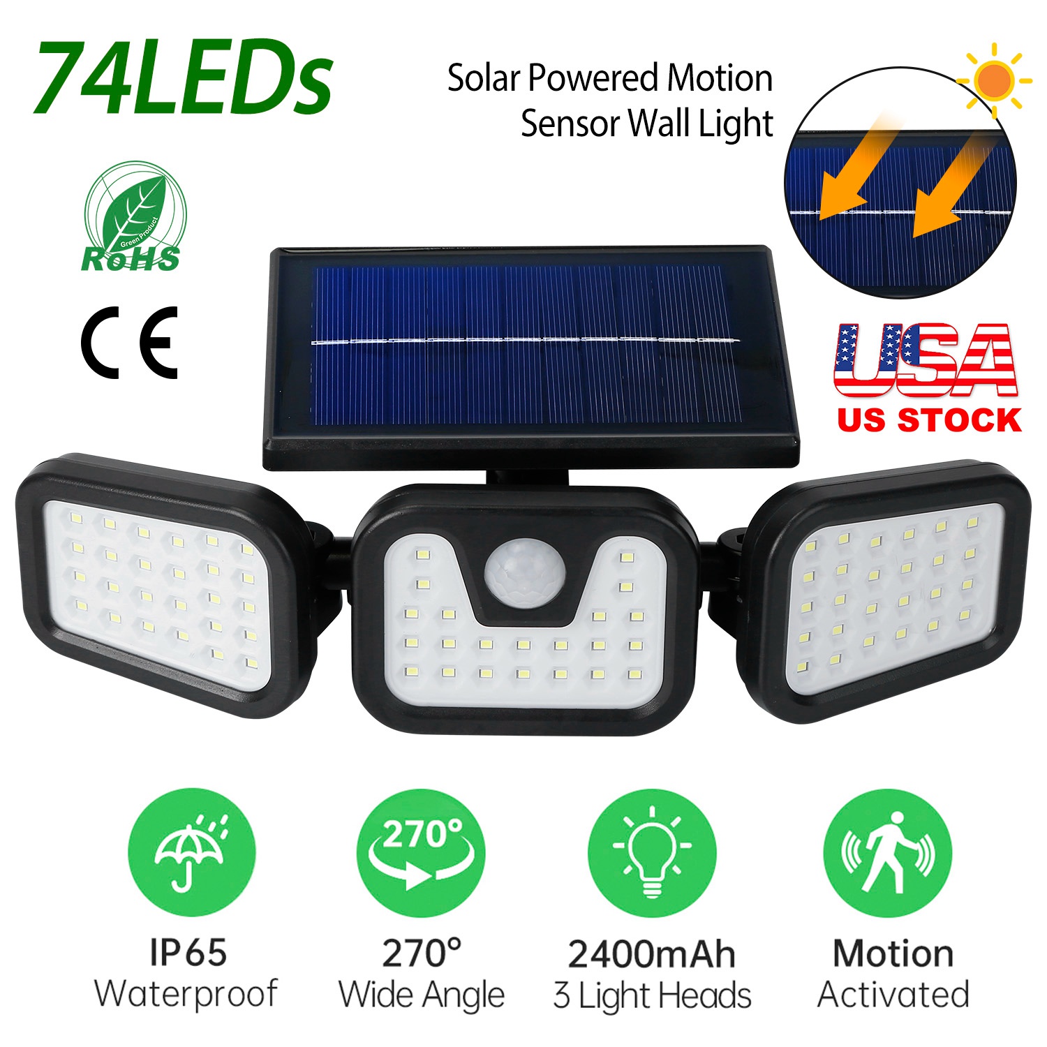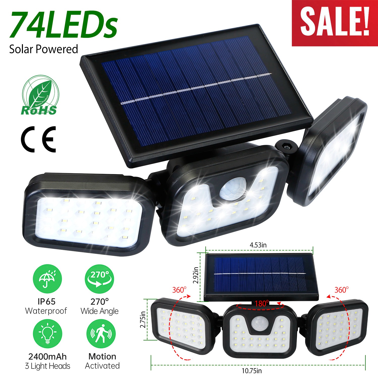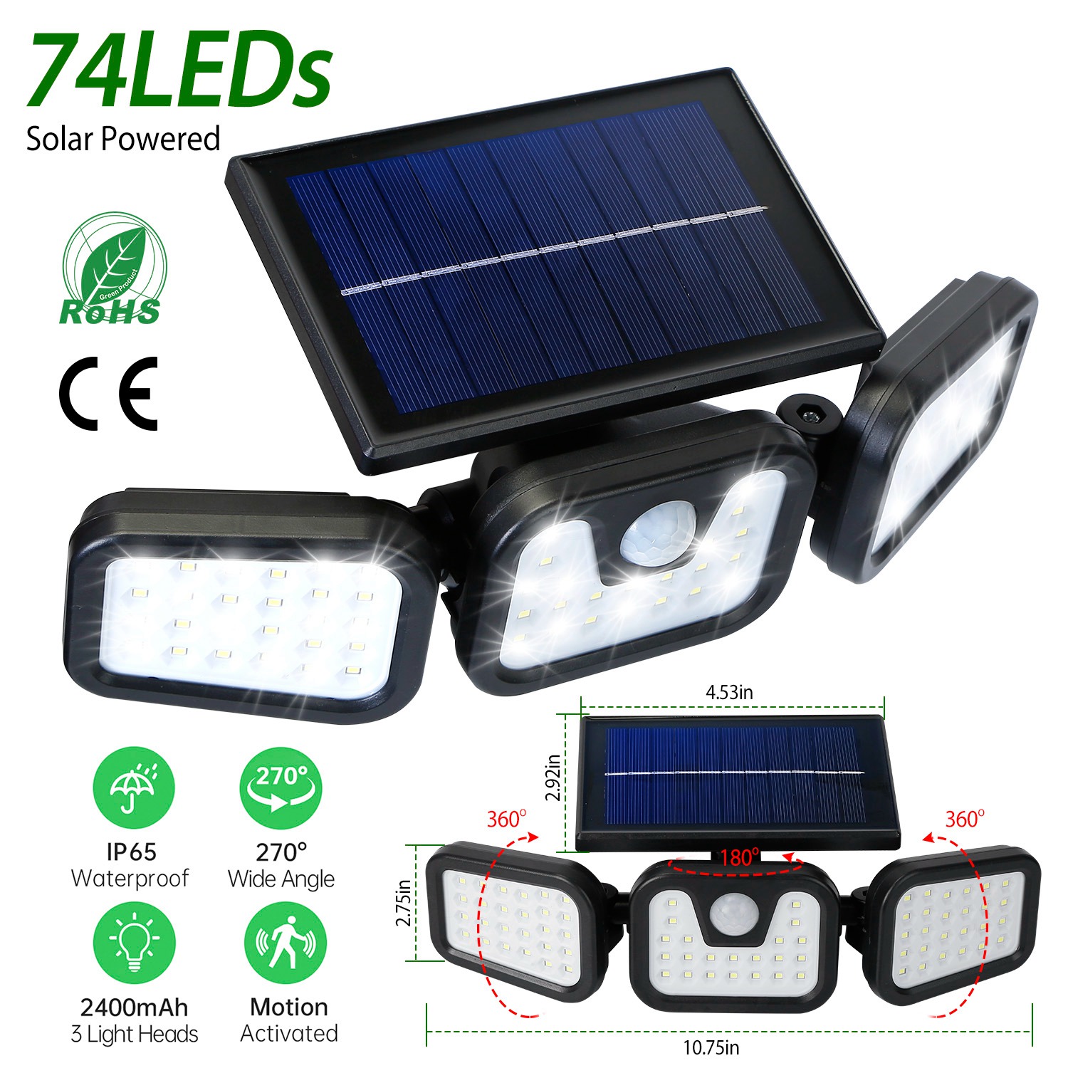 Home > Solar Wall Lamp 74 LEDs 3 Adjustable Head Motion Sensor Flood Light IP65 Waterproof Security Light Outdoor 270° Wide Angle Light For Garage Front Door
