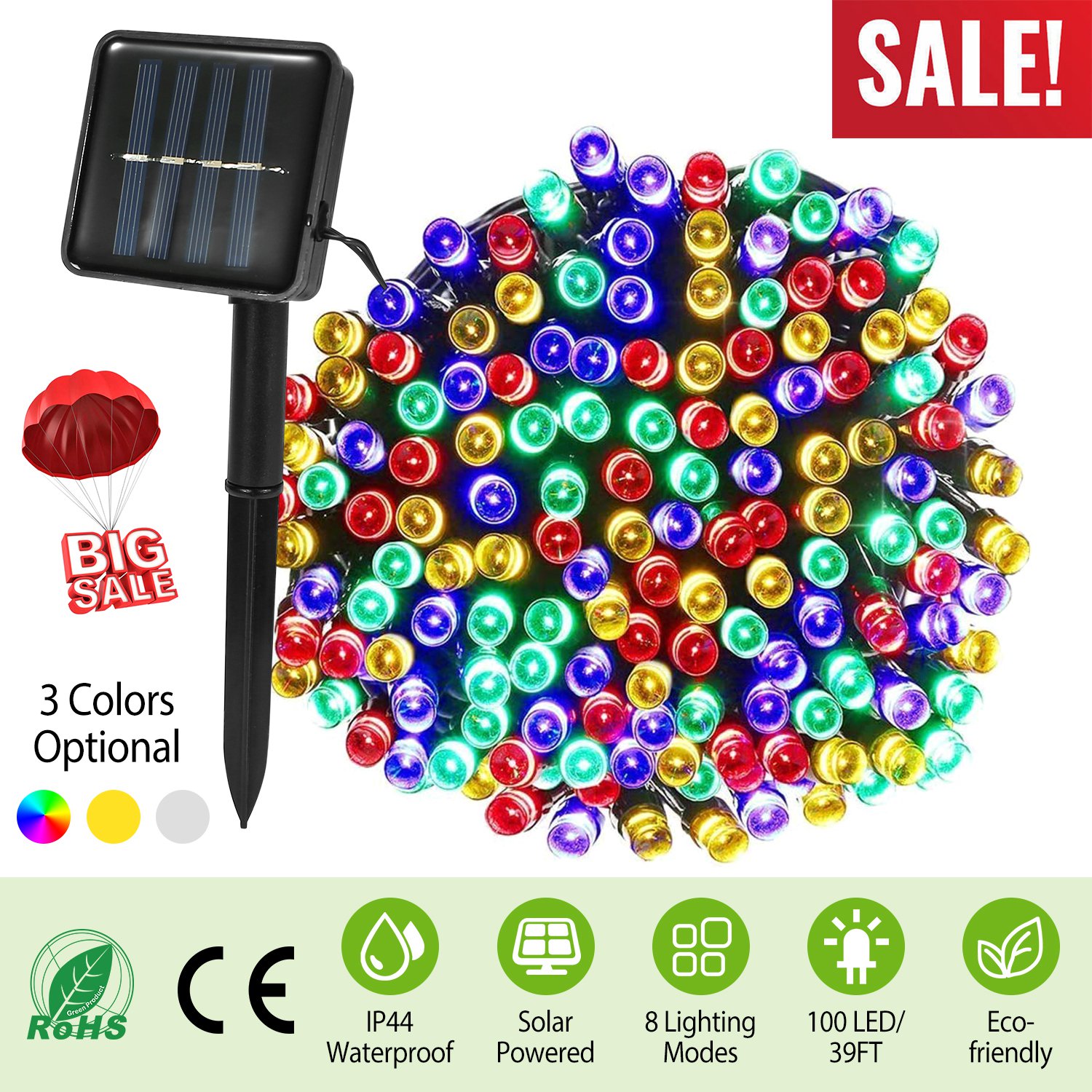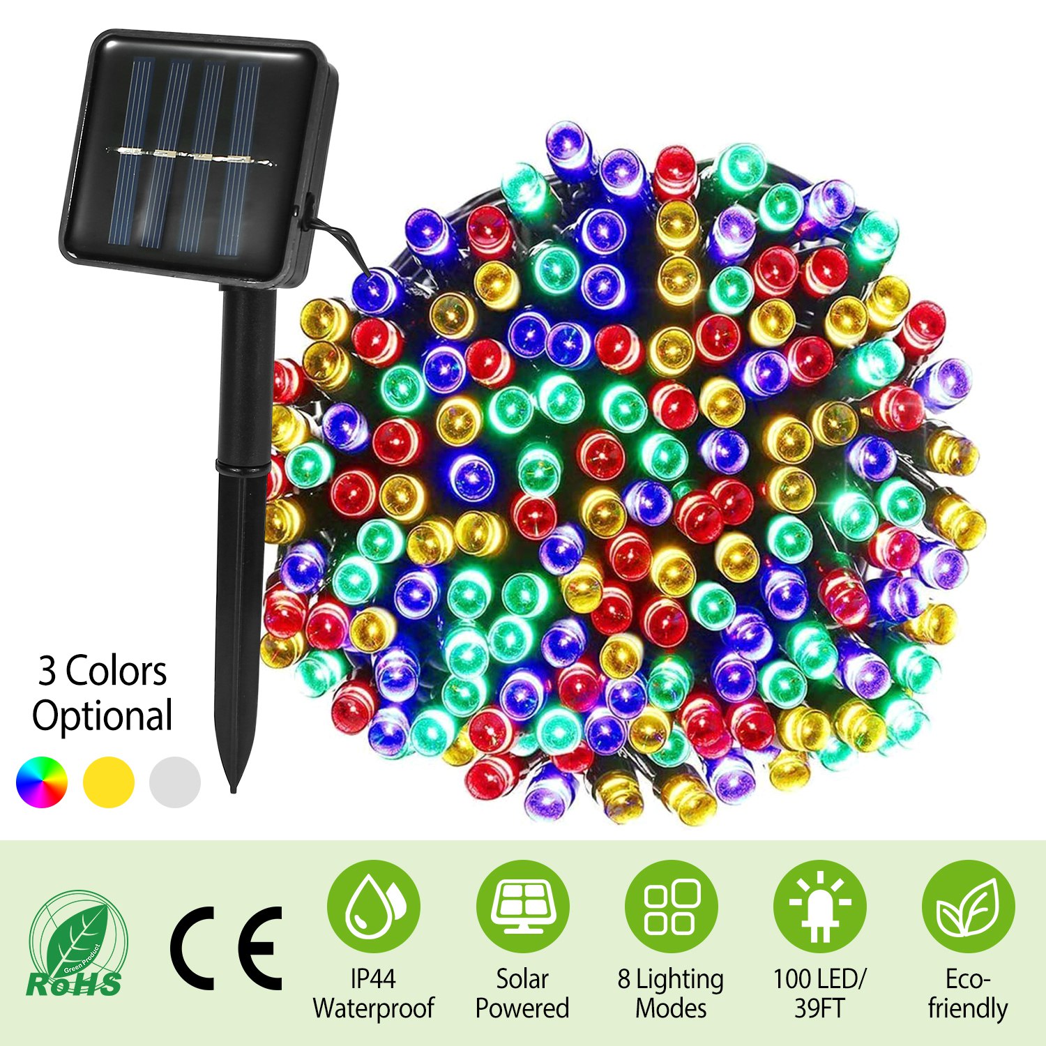 Solarek LED solar light string featuring 100pcs premium colorful LEDs (red light, green light, blue light and yellow light), 8 light modes (5 flash modes, 1 always light mode, 2 gradually brightening modes) and 39ft long cable can be can be flexibly wrapped on fences, handrails, lawn, trunks or gazebos to create a fairyland and cheerful atmosphere in various parties including wedding party, Christmas party, holiday party, birthday party, etc., amusement park, hotels, bars, clubs, concerts, karaoke, fashion shows, etc. Additionally, it is charged by solar energy, no extra electricity cost. Furthermore, it can automatically turn on at dark and automatically turn off in day time.