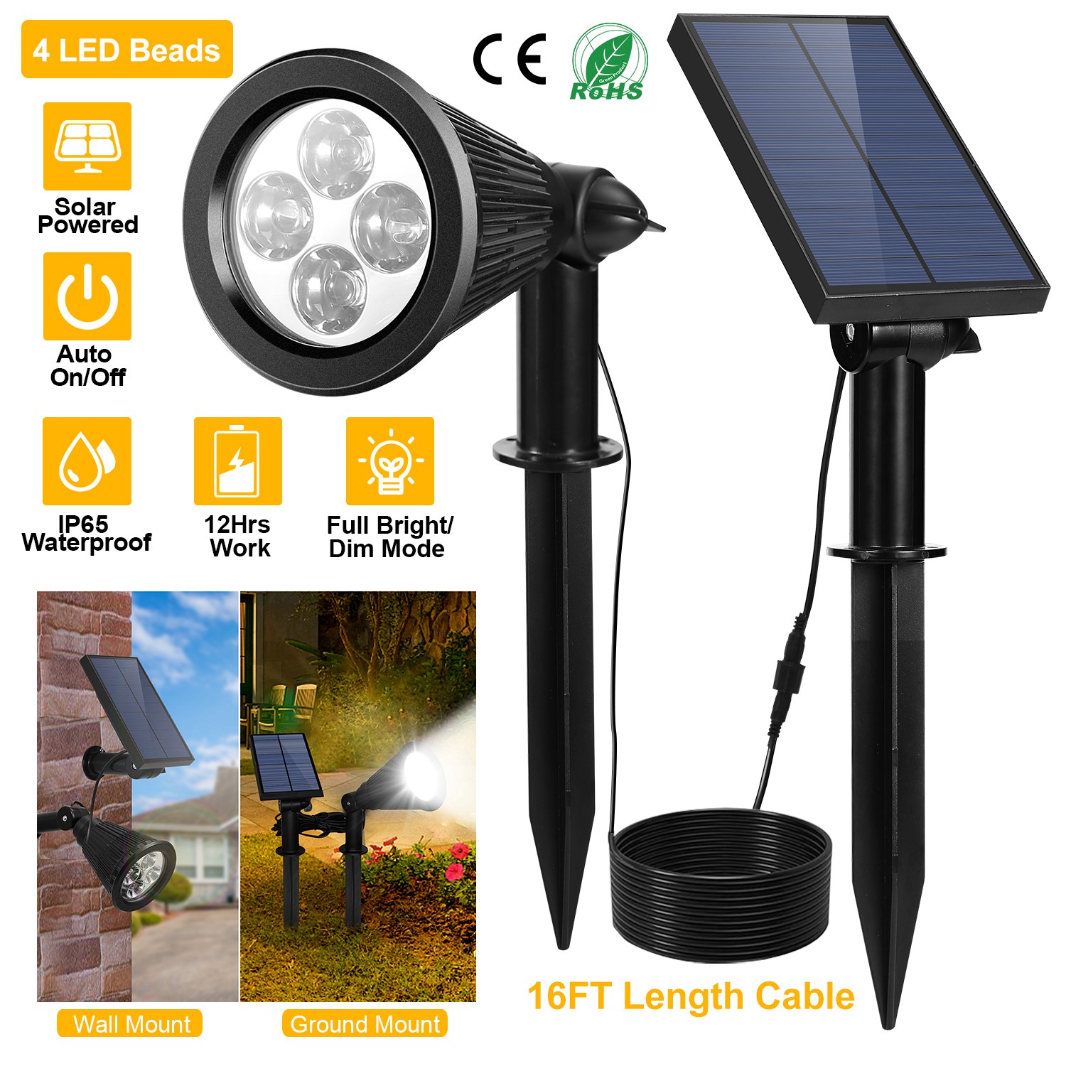 The solar lighting is all the rage, which reduces electricity charge and avoids complex line engineering. Our solar spotlight support light sensing (it will automatically turn on in low brightness/at night and automatically turn off as it senses light source). Comes with 4pcs LED beads and support two lighting mode offering up to 260lm brightness (depending on lighting mode). Moreover, the solar spotlight allows you to adjust lighting angle (180°) to get optimal illumination and adjust solar panel (90°) to place it in well-lit location. Its built-in 2000mAh battery supports about 7-12 hours working time after fully charged.