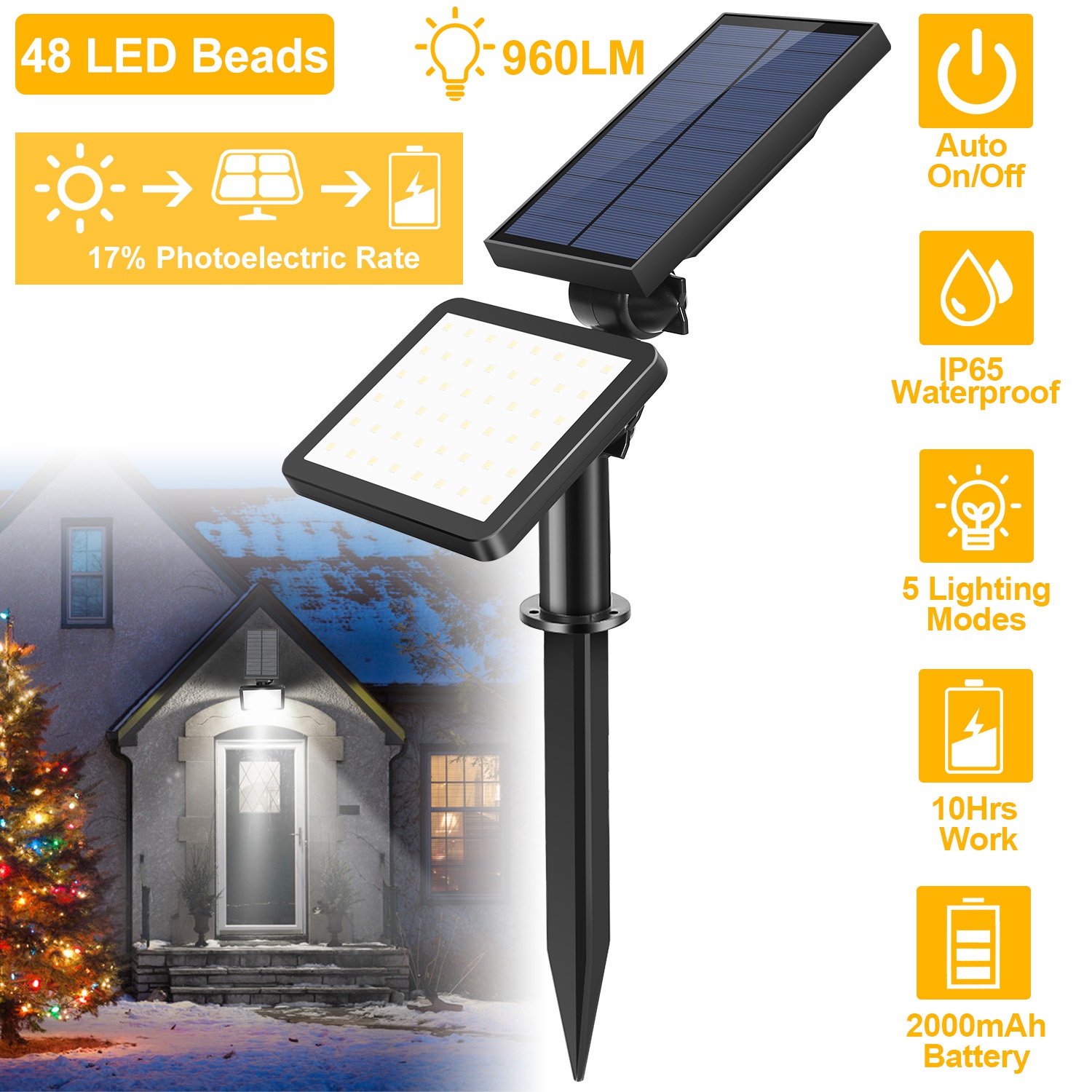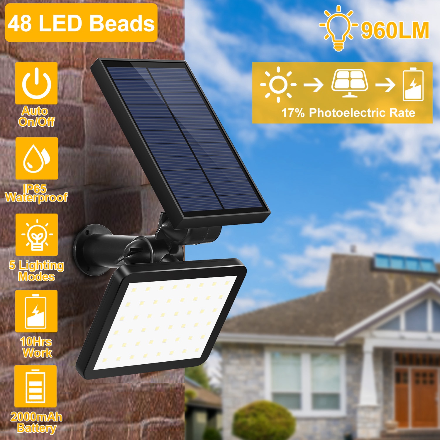 Our Solar light is designed for year-round outdoor use supported by its IP65 waterproof performance and the structure flexibility. Both of the solar panel and light panel can be easily adjusted to tilt for ensuring maximum sunlight receiving and optimal illumination angle in all weather conditions. You can either stick it into ground or mount on the wall with provided accessories. Built-in 48 SMD LEDs provides bright light in 5 modes including 100% bright mode, 60% bright mode, 30% bright mode, flashing and SOS signal. It’s great for illuminating your wall, patio, yard, pathway, driveway, lawn or garden.