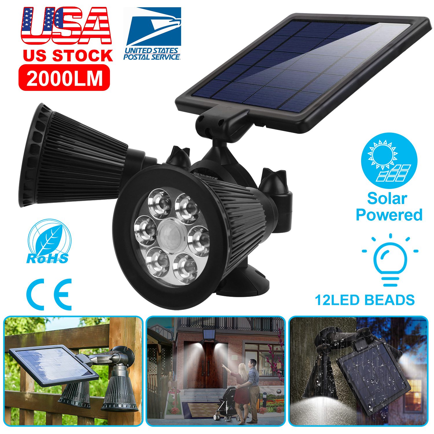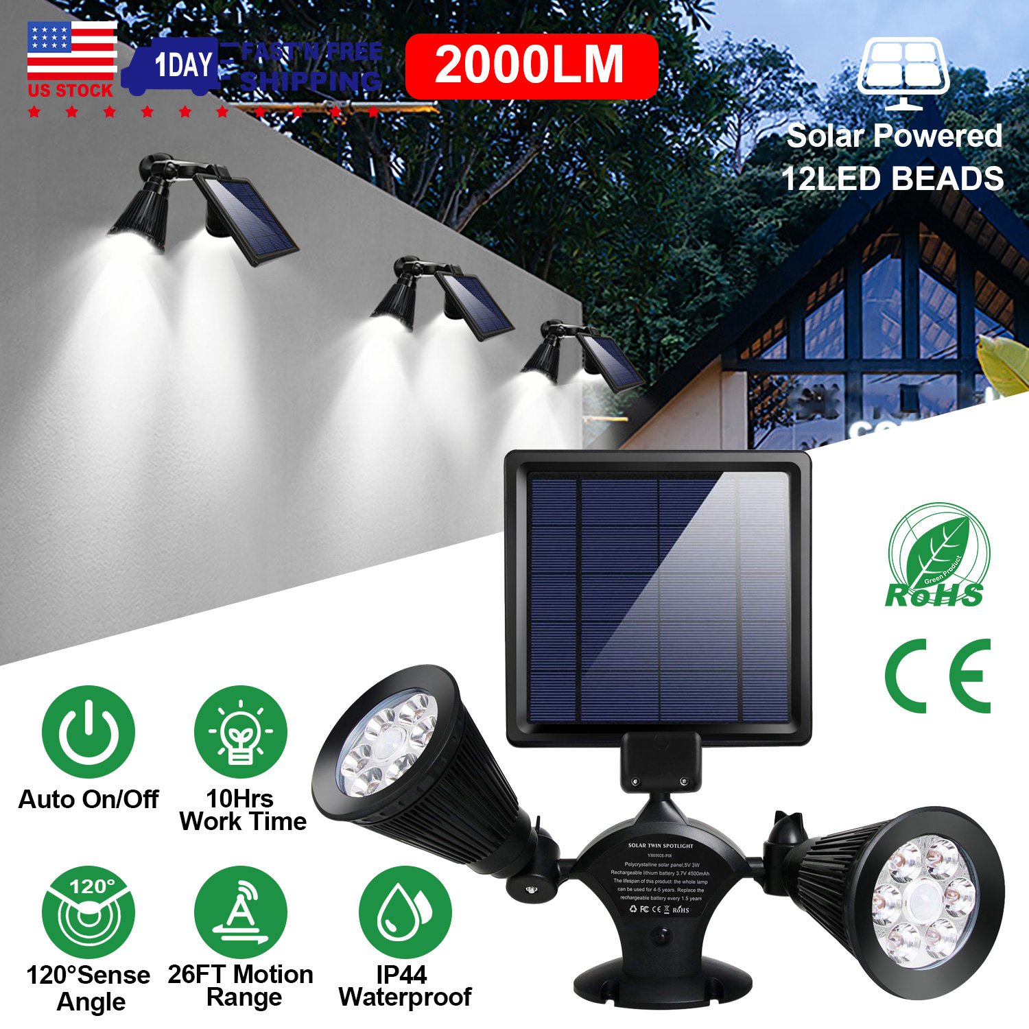 Our dual head Solar lights comes with a PIR motion sensor with 120° detection angle and up to 26ft motion distance and support light sensing (it will automatically turn on in low brightness at night and automatically turn off at dawn). In full bright mode (2000lm) when motion detects and stays for 60S, then turns into dim light mode (100lm) when motion leaves. Tilt Solar panel and rotatable dual light head enables our Solar light to fully charge about 4.5Hrs in direct sun and illuminate 10Hrs at optimal angles in the dark. IP44 waterproof and heatproof performance resist bad weather, 2 way installation via included screws and widely used in illuminating garage, front door and pathway, etc..