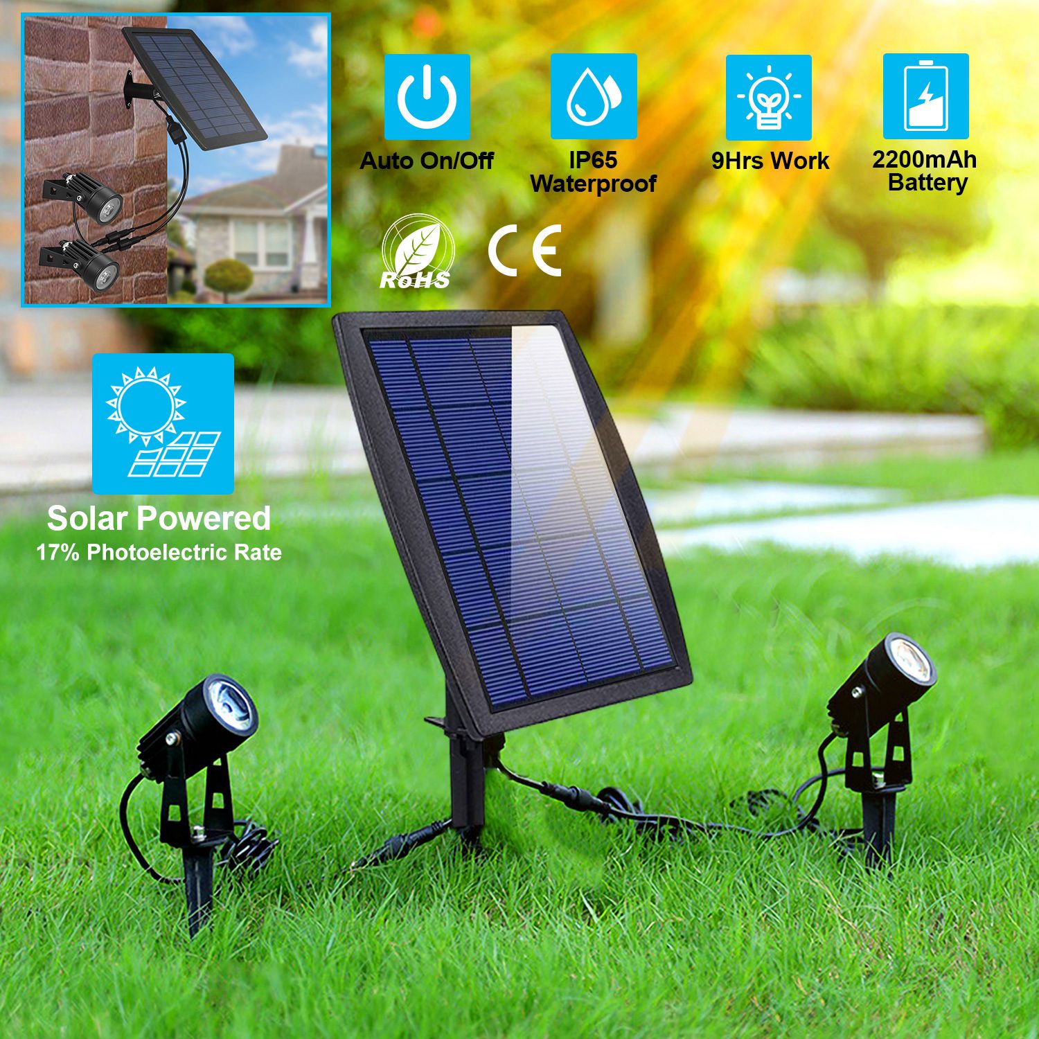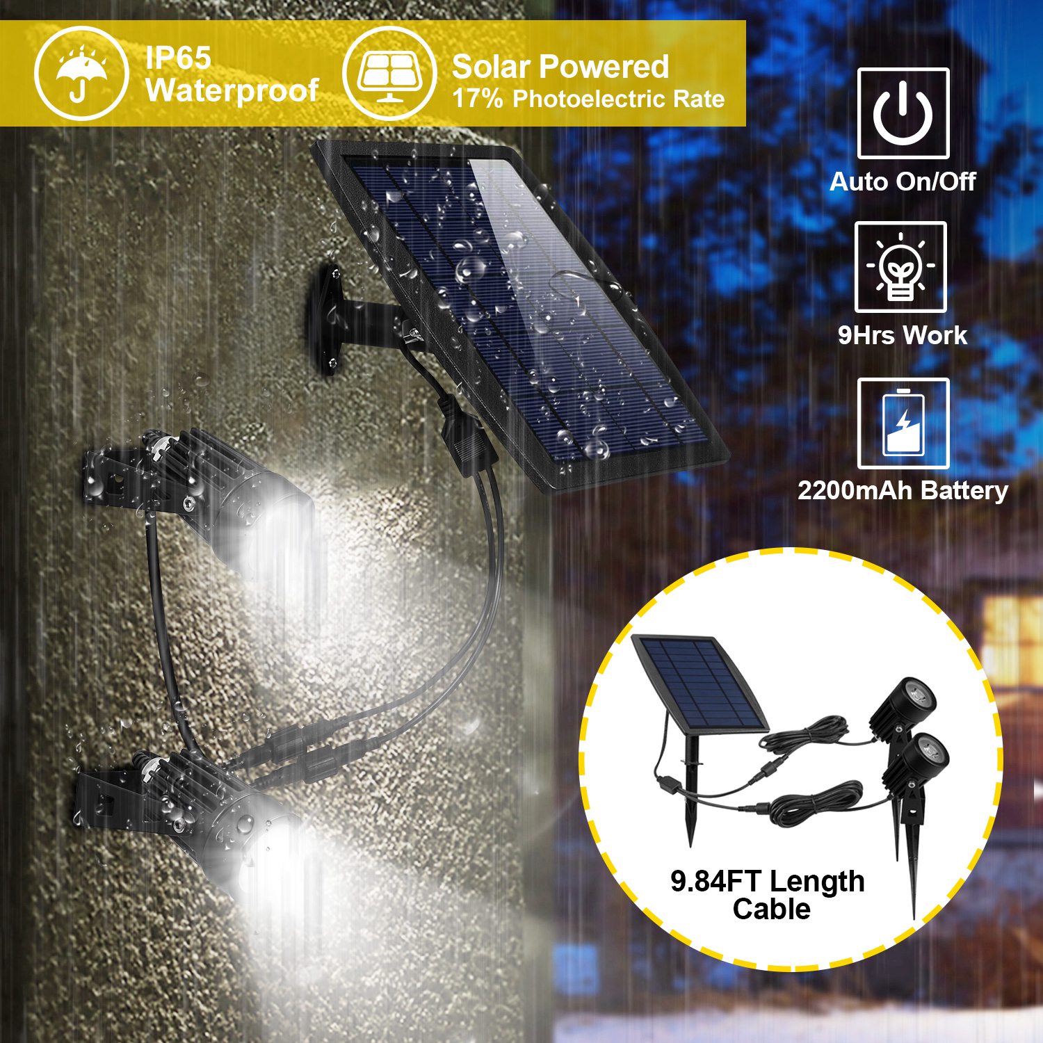 The solar lighting is all the rage, which reduces electricity charge and avoids complex line engineering. Come with sensitive light sensor, auto on at night and off during the day. With 2Pcs upgraded LED beads, offering total 2000lm brightness. The solar spotlight allows you to adjust lighting angle (90°) to get optimal illumination and adjust solar panel (180°) to well-lit location. Its built-in 2200mAh battery supports about 9 hours working time after fully charged. IP65 Waterproof and durable materials are optimal for free outdoor use even in rainy, snowy or other weather conditions.