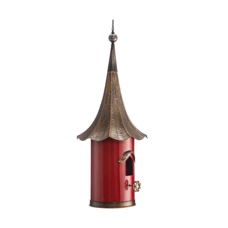 This Outdoor Red Metal Bird House with Vintage Bronze Phonograph Style Roof is sure to draw your feathered friends – as well as compliments from guests and family members. The house is made from bronze and has a red painted finish that’s been purposefully distressed for a weathered look. The pagoda-style roof is unfinished metal with an aged patina that adds to the vintage appearance. We love the bronze-colored detail over the door, the perch, and the elongated decorative finial on the top that adds height and visual interest. This birdhouse is weather- and UV/fade-resistant so holds up well in the elements.